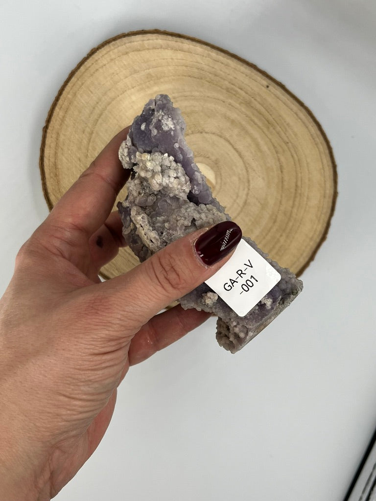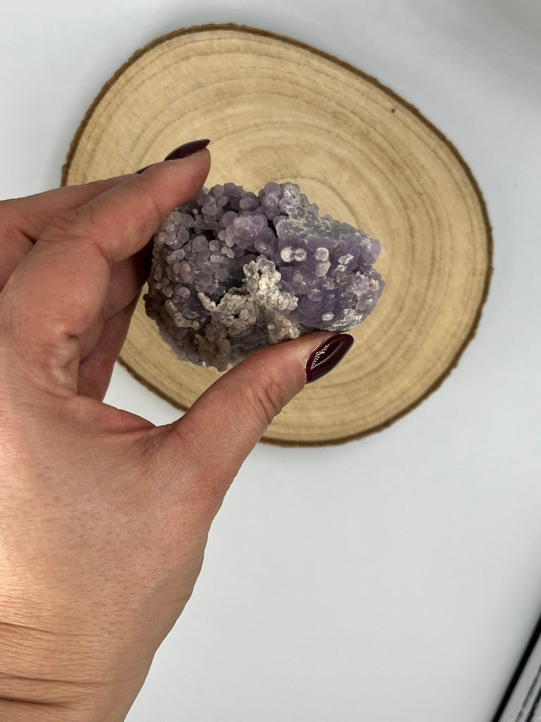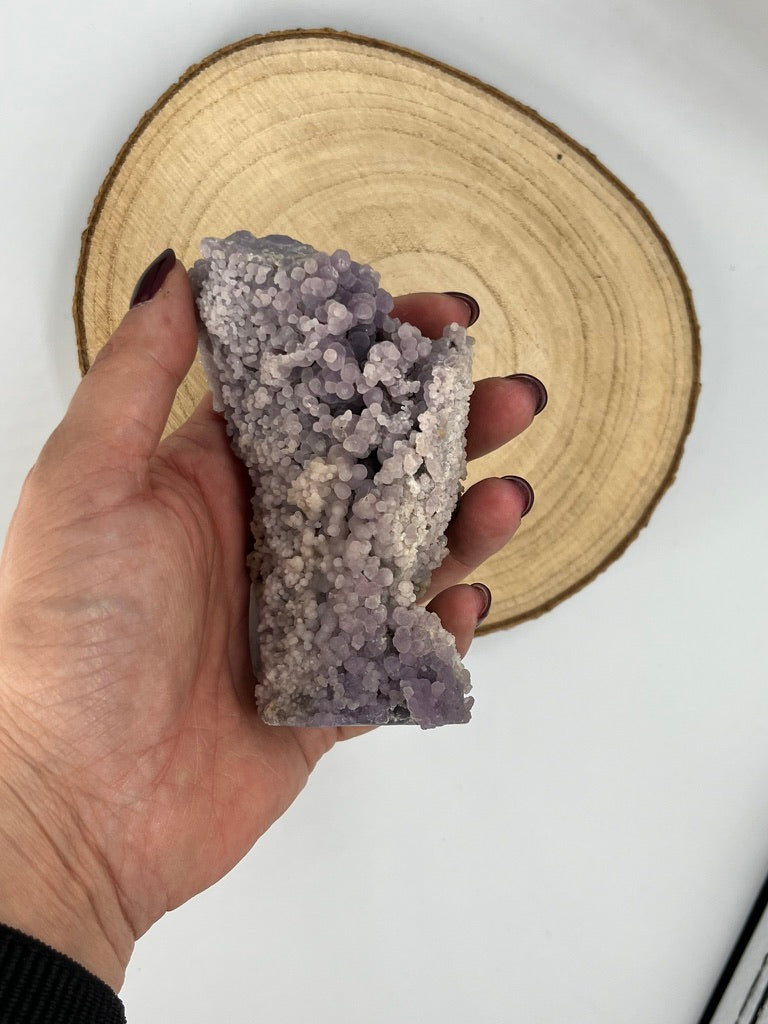 Stojący agat winogronowy, inaczej zwany ametystem winogronowym lub chalcedonem winogronowym – surowe piękno natury w fioletowo-lawendowej odsłonie. Wygląda jak kamień z innej planety, a jednocześnie emanuje spokojem i harmonią 💜