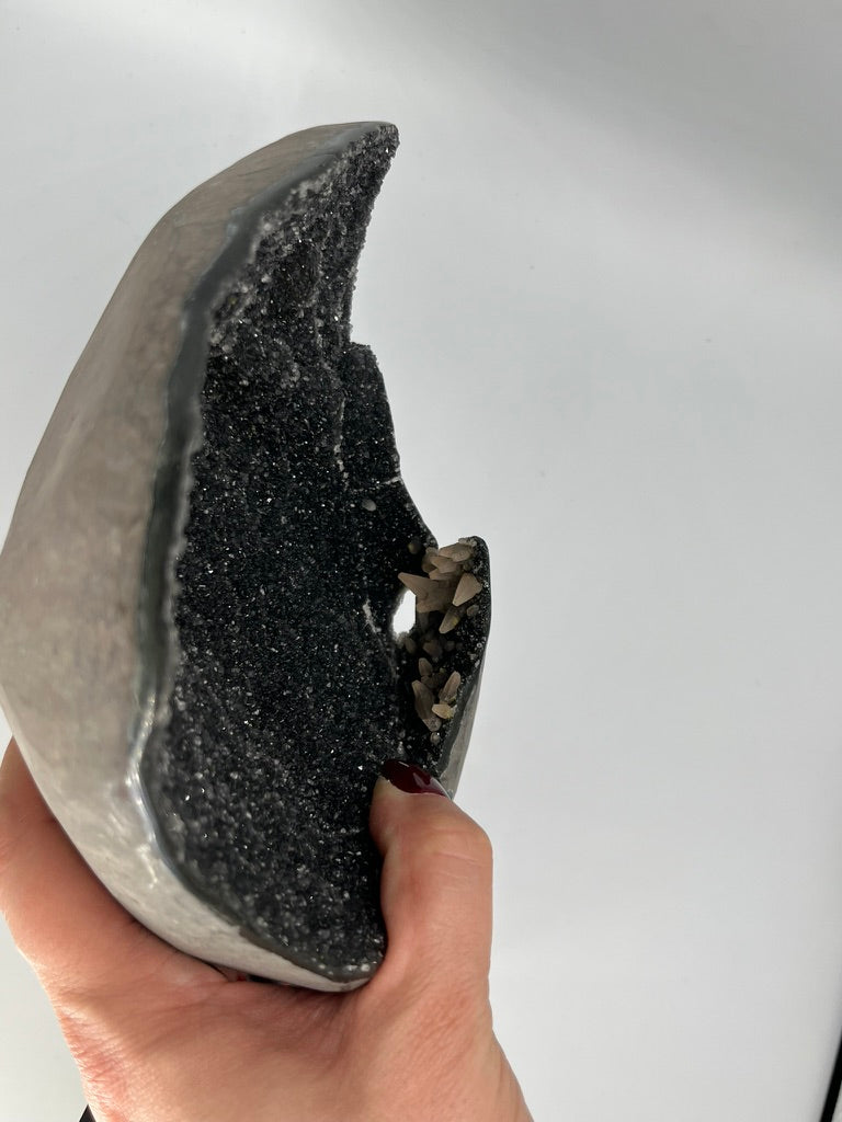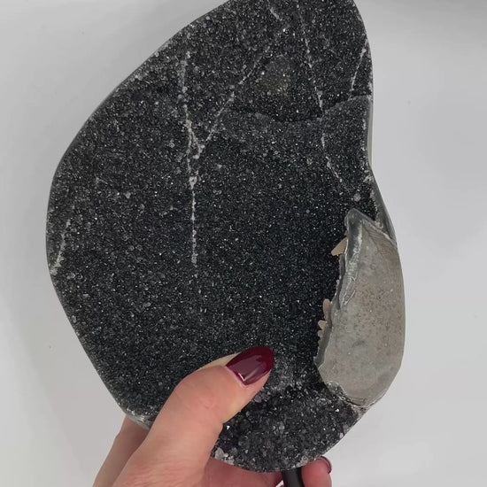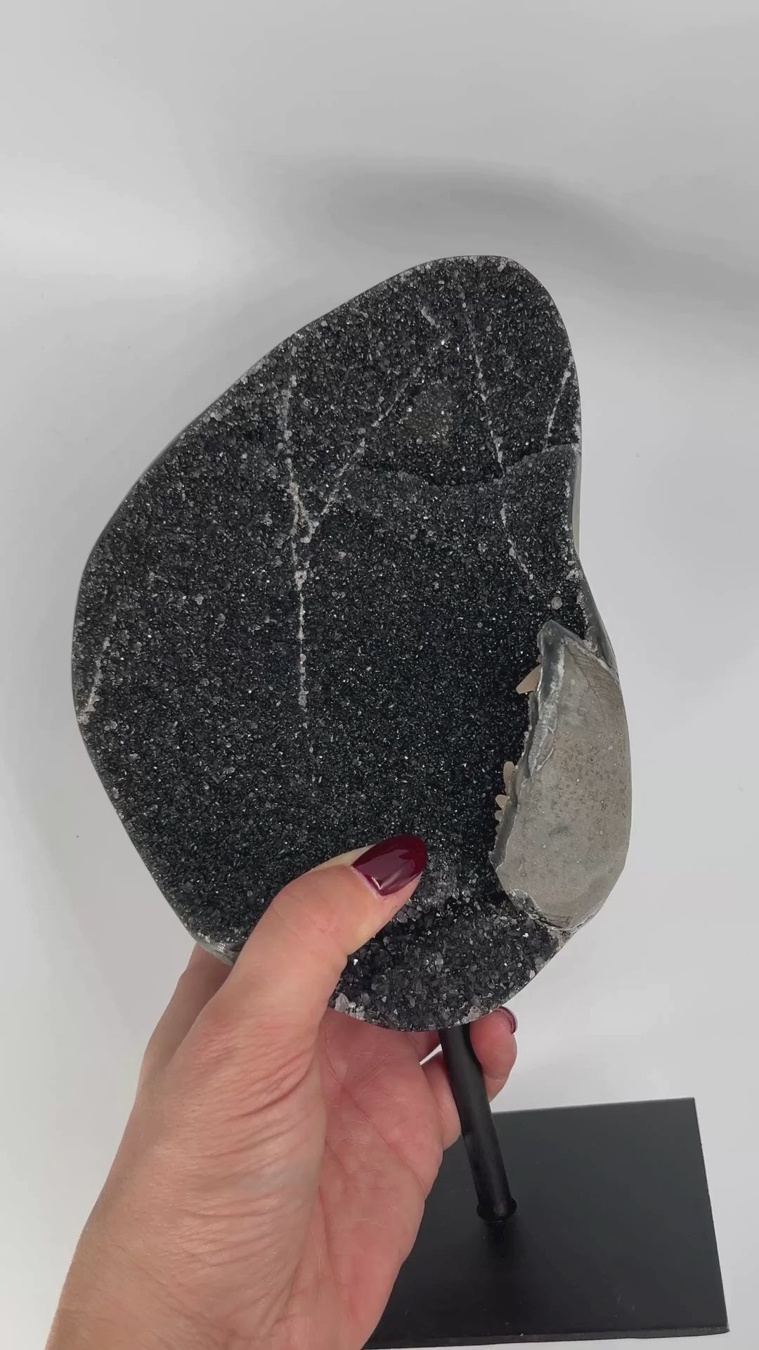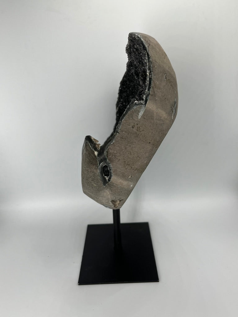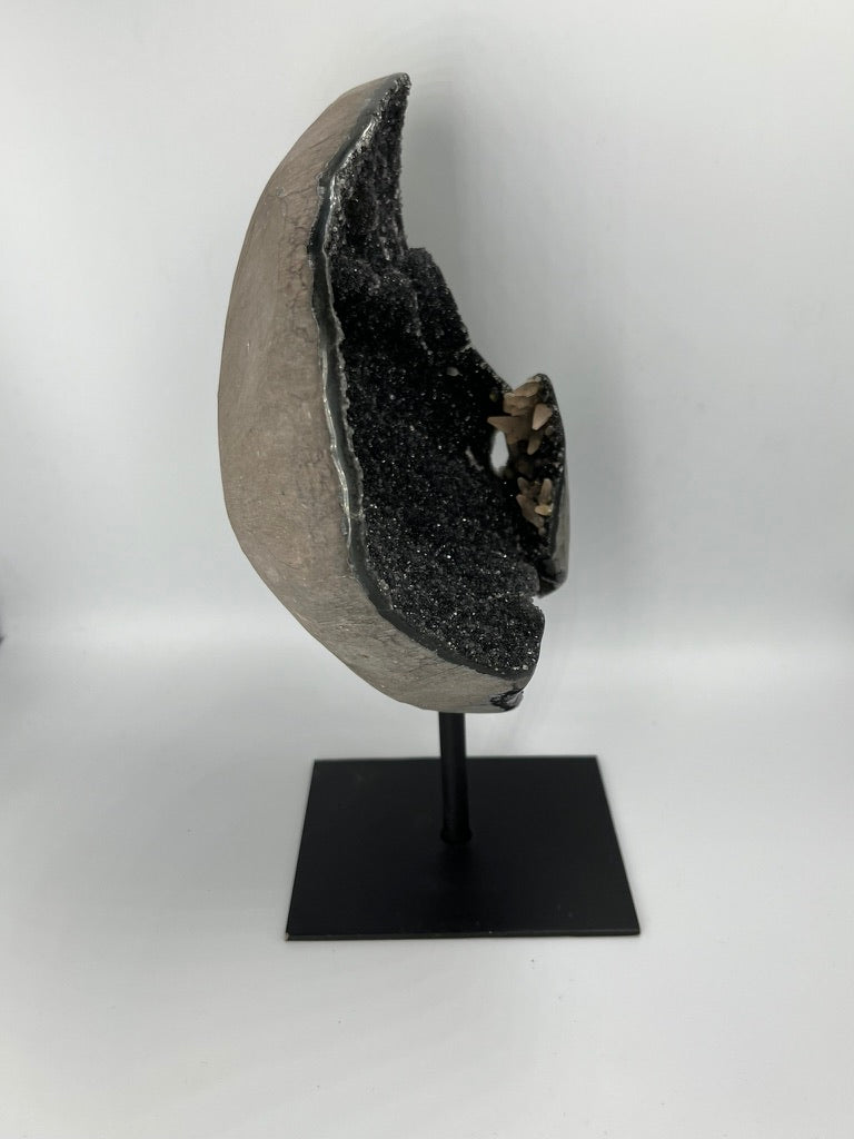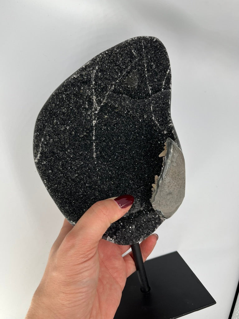 Ametyst Black Galaxy na czarnym standzie – głęboki, zmysłowy i pełen tajemniczego blasku. Idealny dla tych, którzy lubią elegancję z nutą mroku 🖤