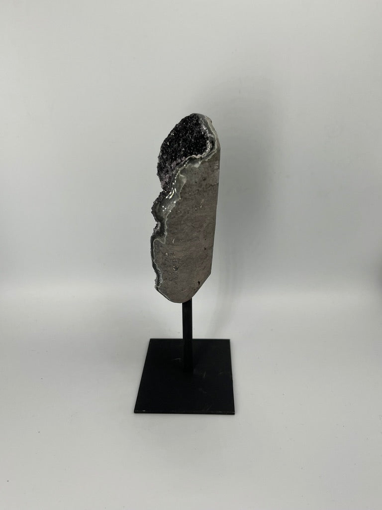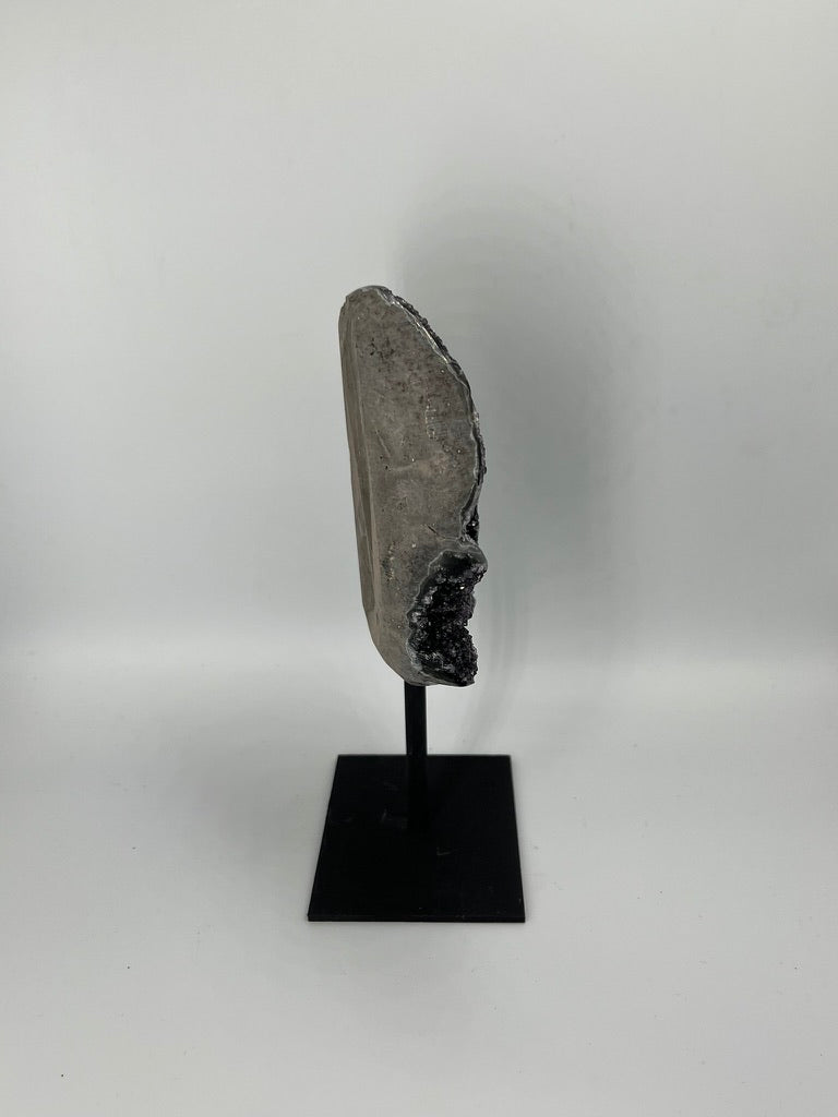 Ametyst Black Galaxy na czarnym standzie – ciemny, elegancki i pełen kosmicznego blasku. Ma w sobie spokój, ale też potęgę wszechświata 🖤