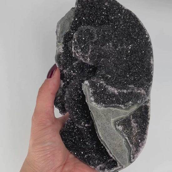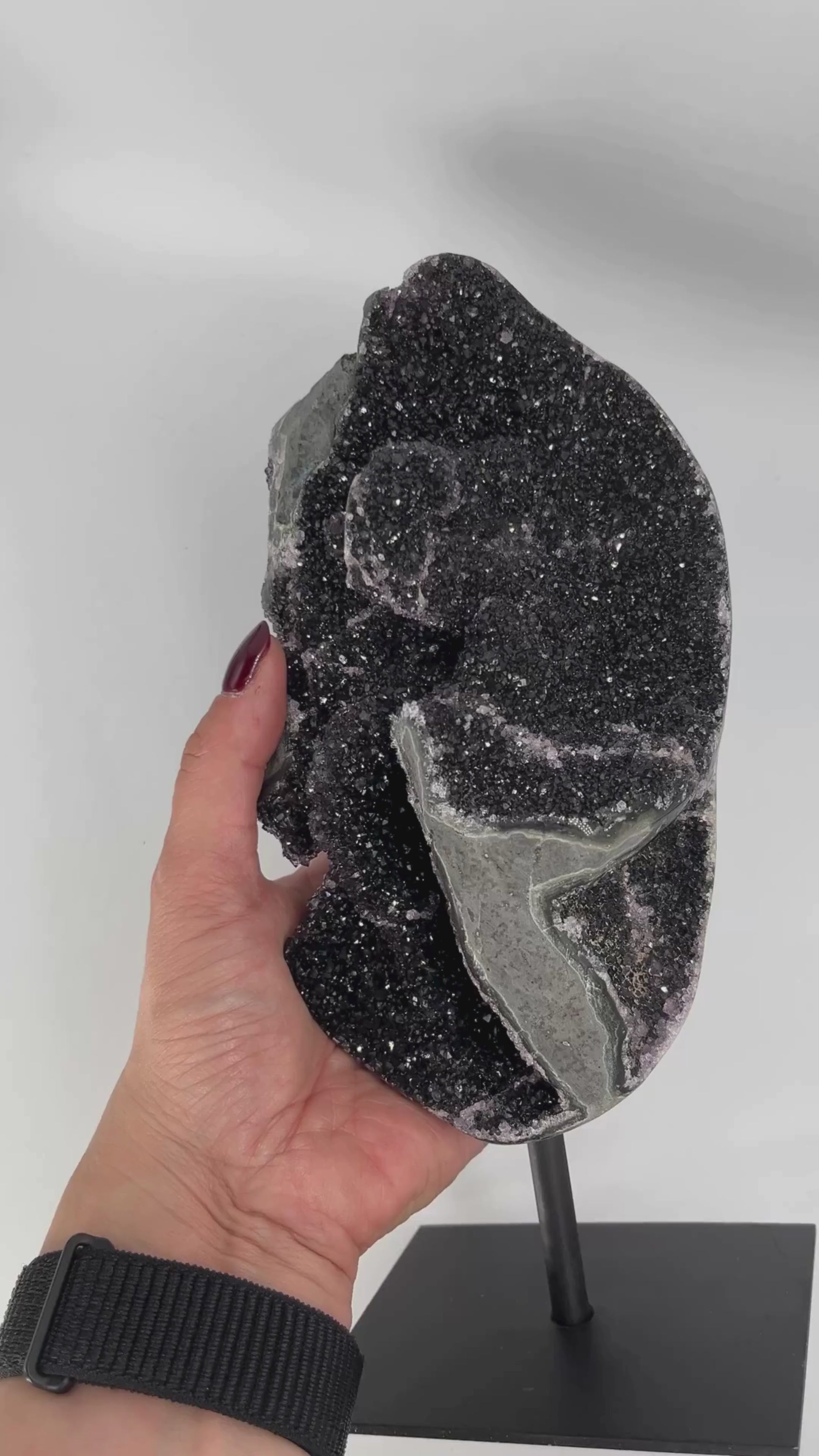 Ametyst Black Galaxy na czarnym standzie – głęboki, tajemniczy i hipnotyzujący, jak nocne niebo pełne gwiazd. Elegancja i moc w jednym 🖤