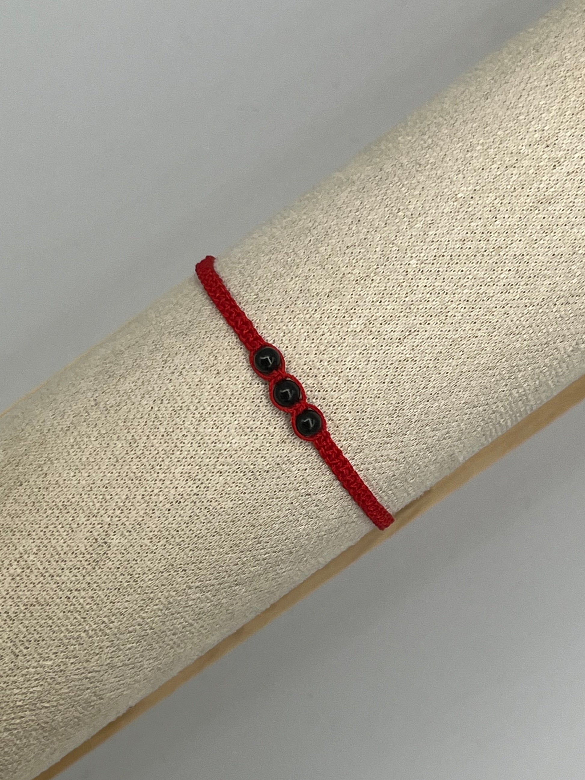 Ręcznie pleciona bransoletka w minimalistycznym stylu, wzbogacona o trzy kamienie czarnego turmalinu – jednego z silniejszych minerałów ochronnych.