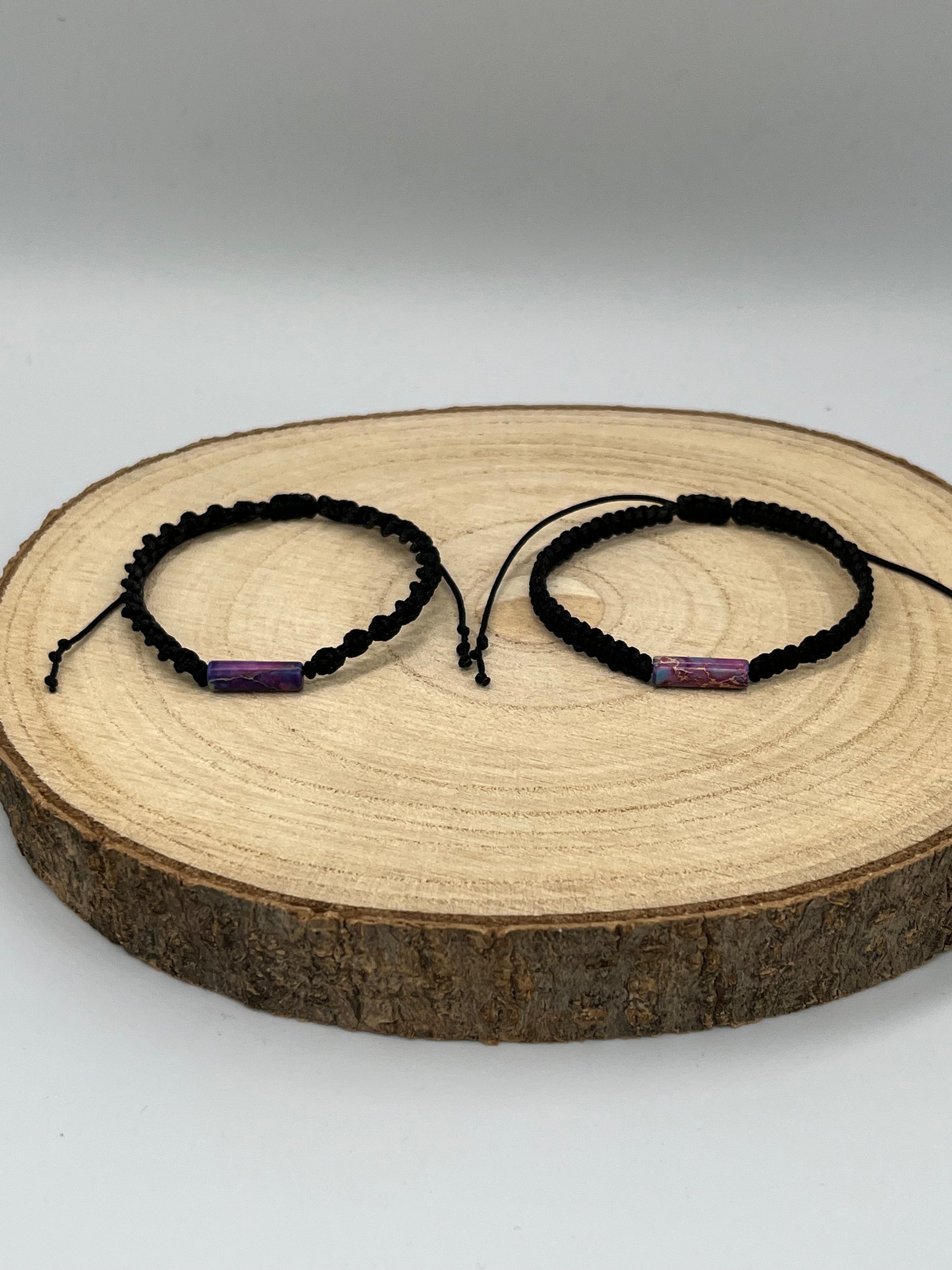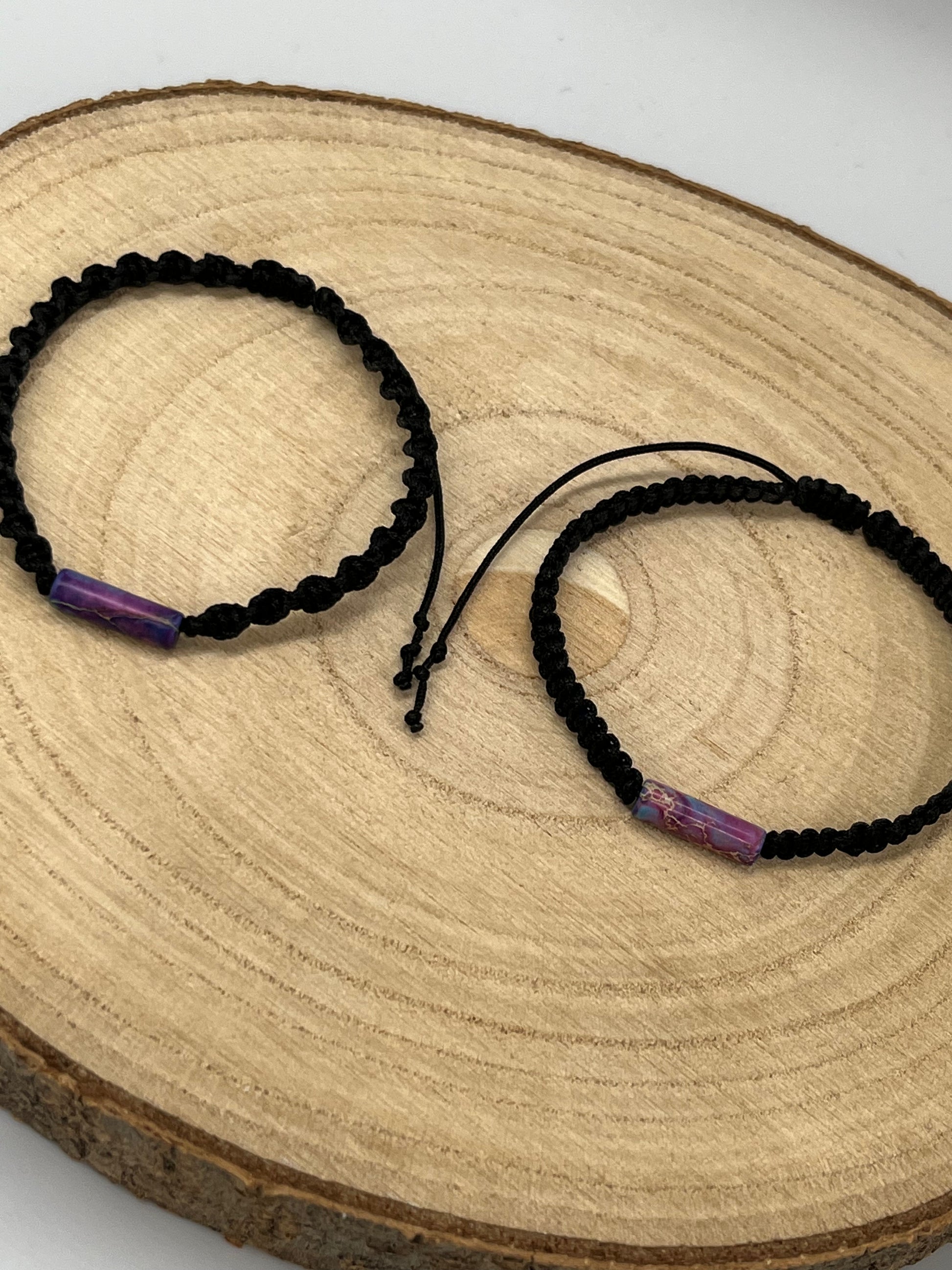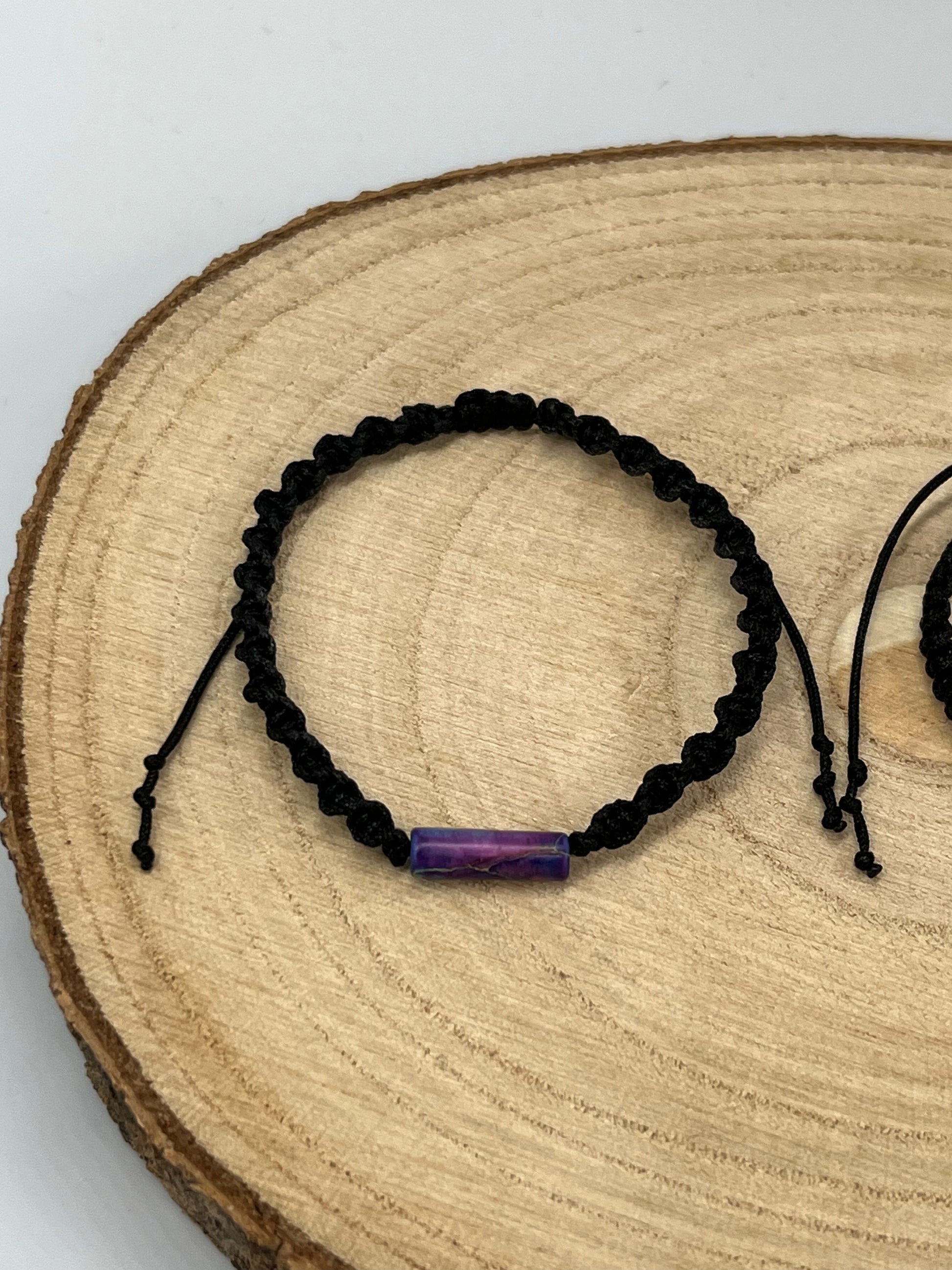 Bransoletka makramowa. Główną rolę gra naturalny kamień w formie walca.