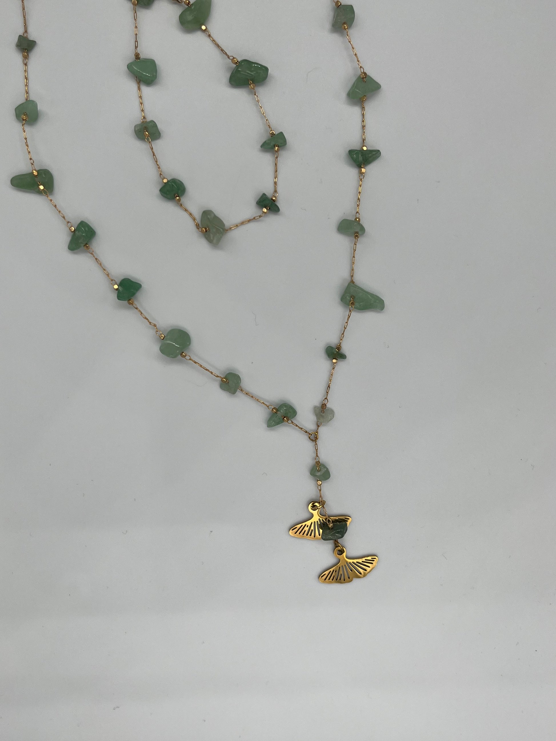 Niezwykle delikatny komplet z awenturynami. Do głębokich dekoltów. Zawieszki w kształcie liści miłorzębu.