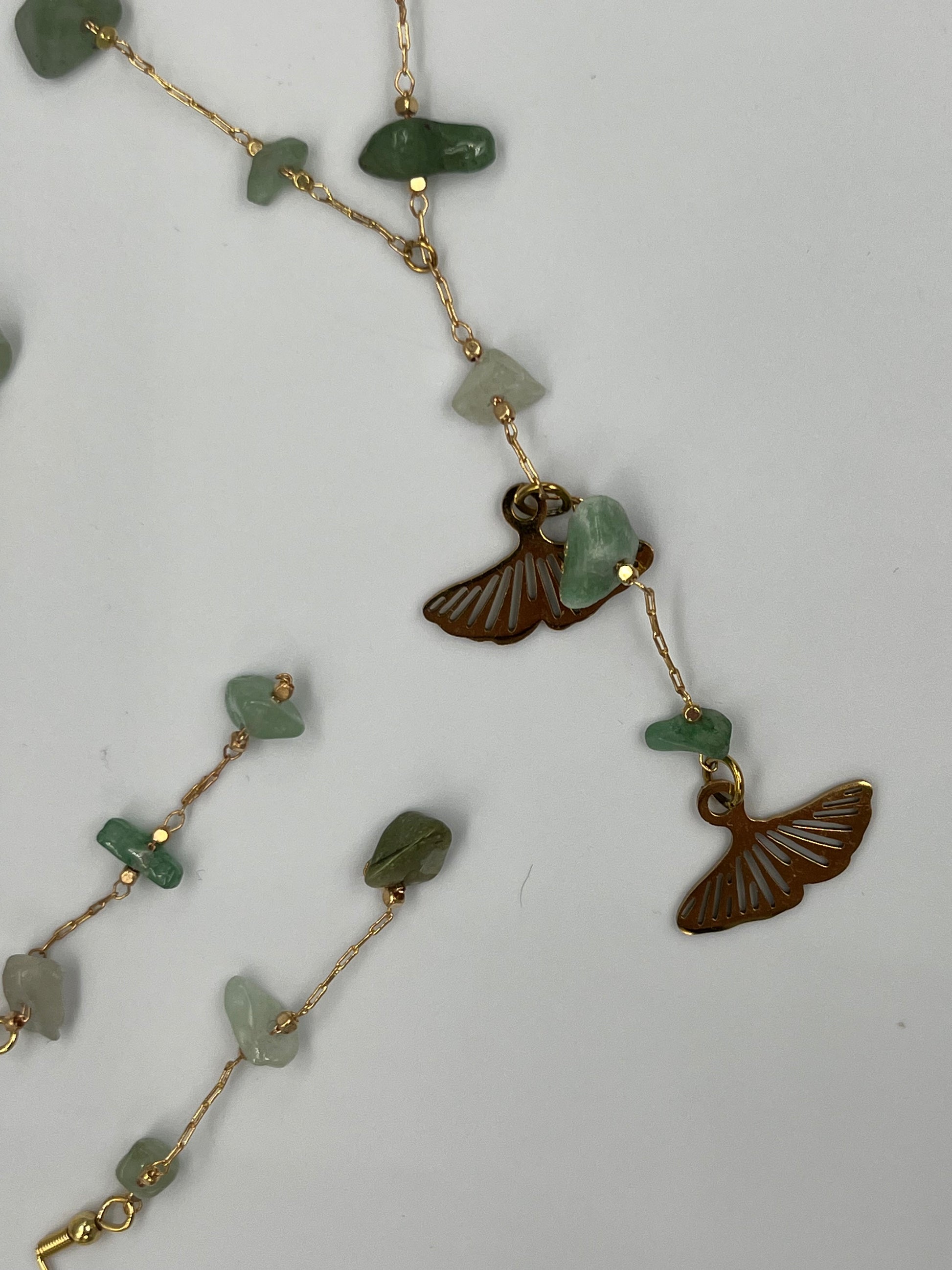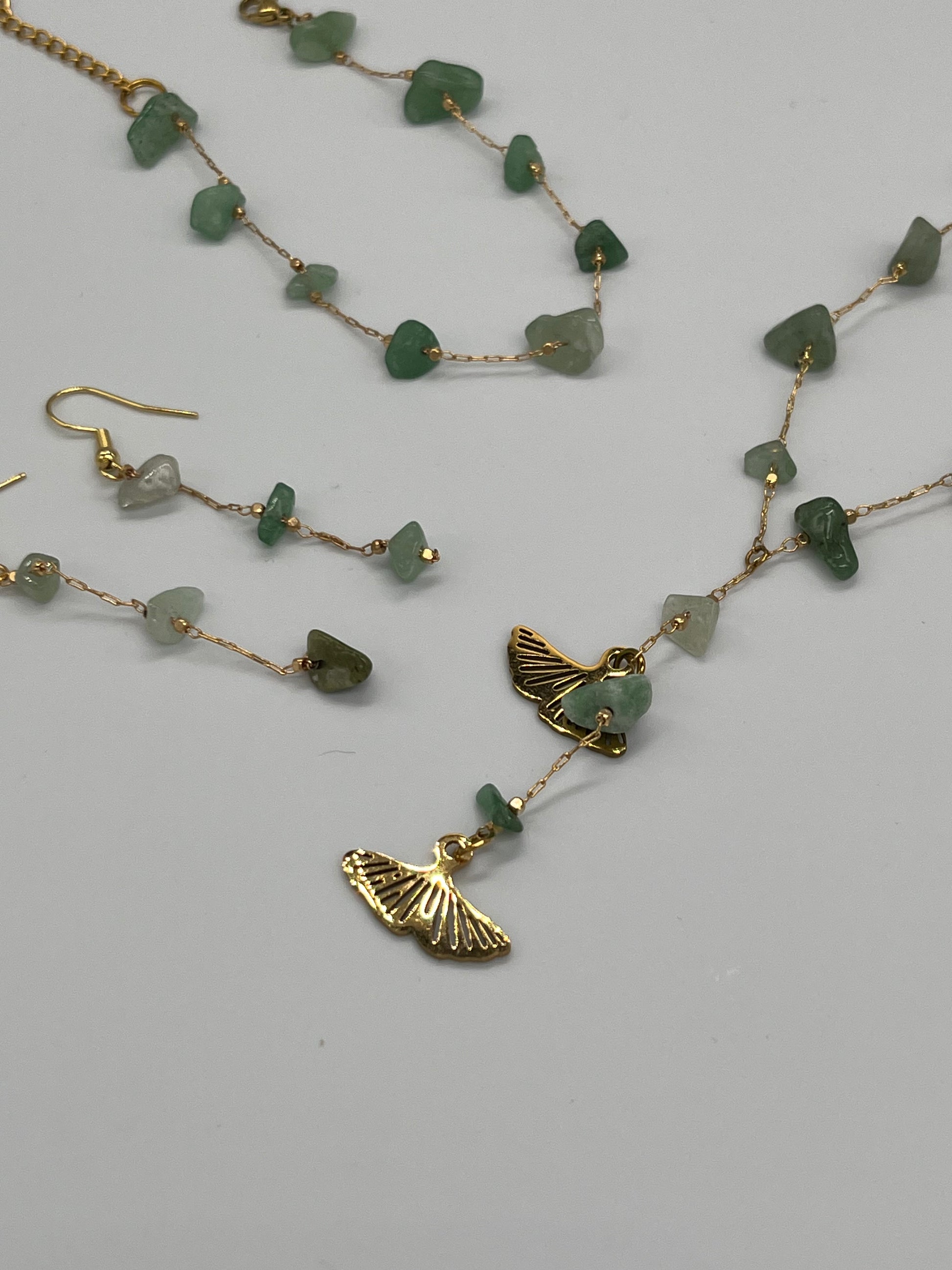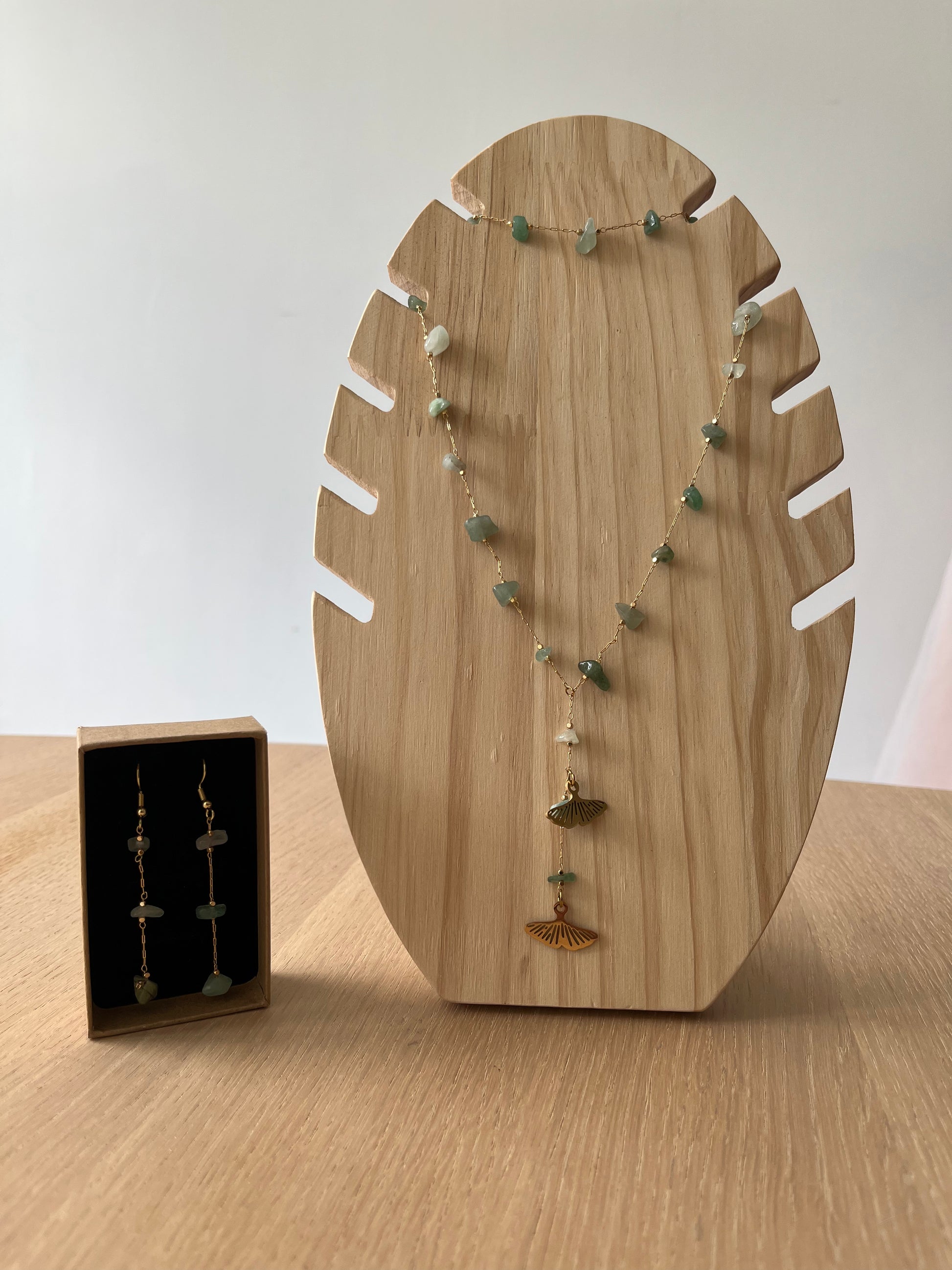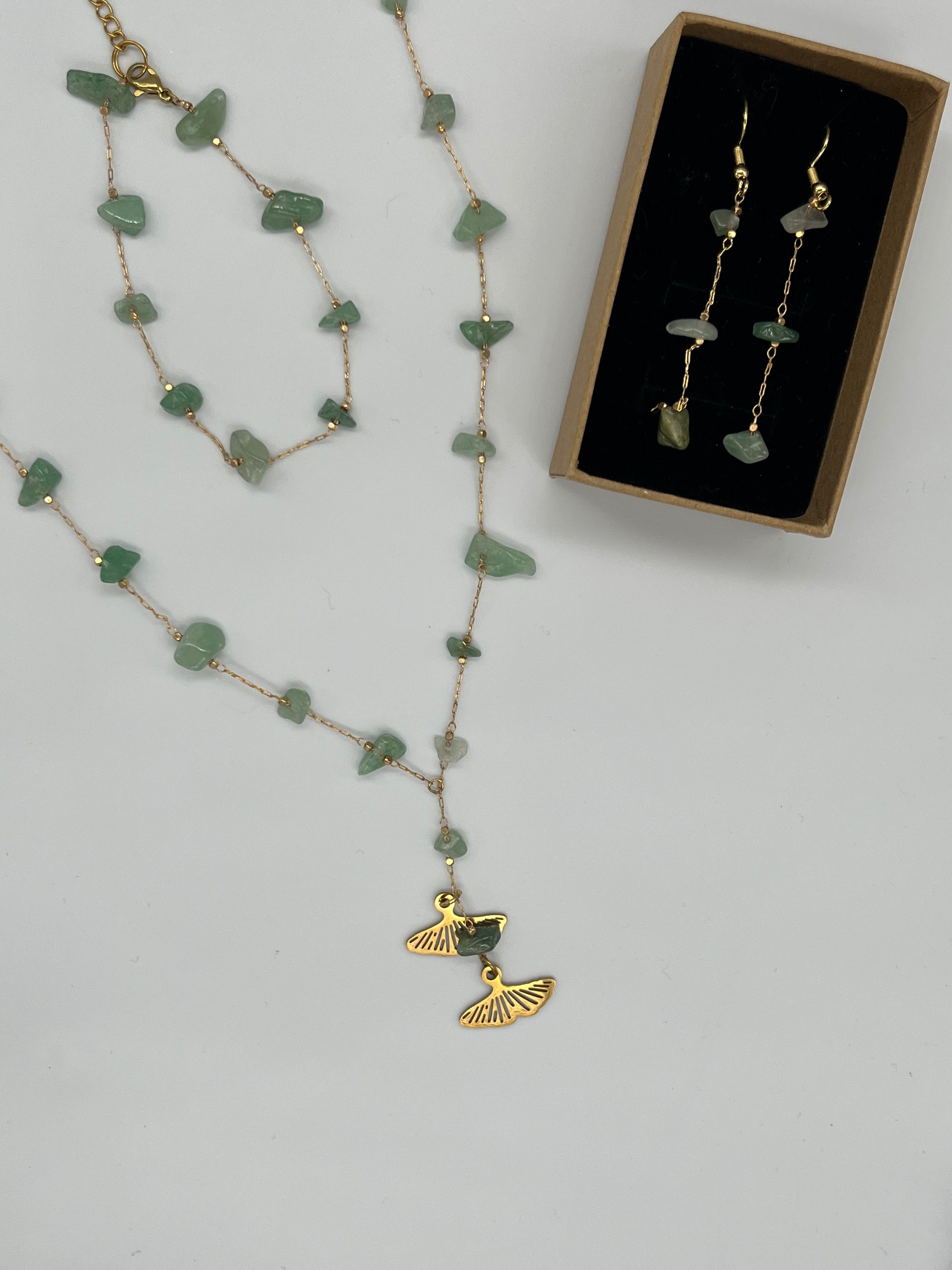 Niezwykle delikatny komplet z awenturynami. Do głębokich dekoltów. Zawieszki w kształcie liści miłorzębu.