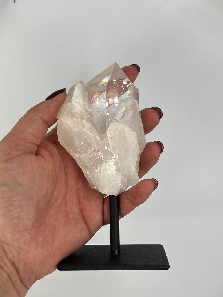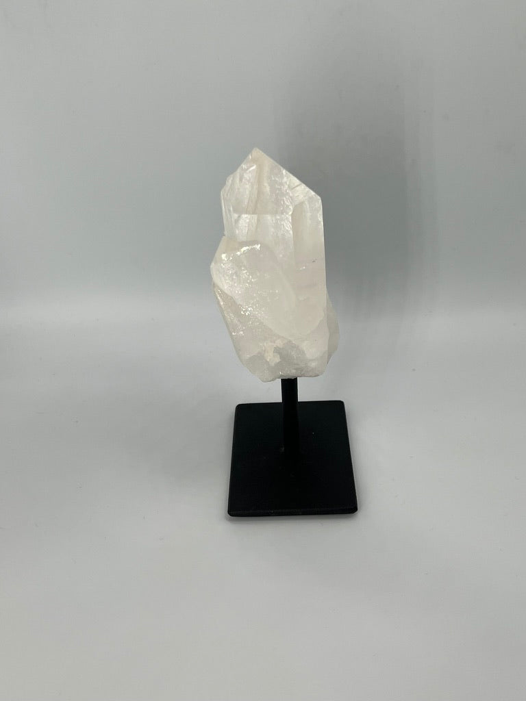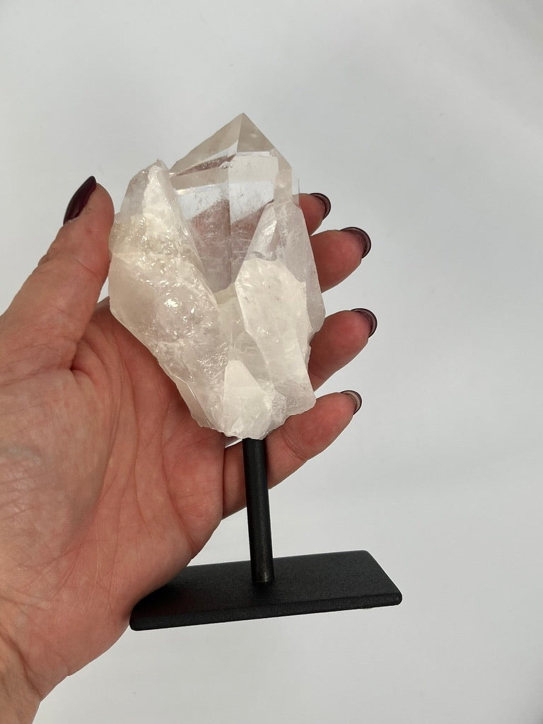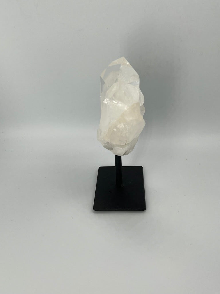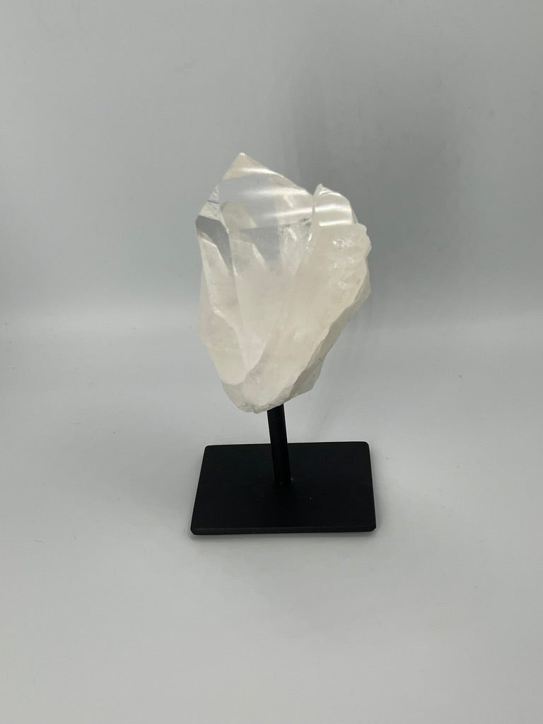 Kryształ górski na czarnym standzie – surowy, naturalny i pełen klarowności. Wnosi do przestrzeni spokój i świeżość 🤍