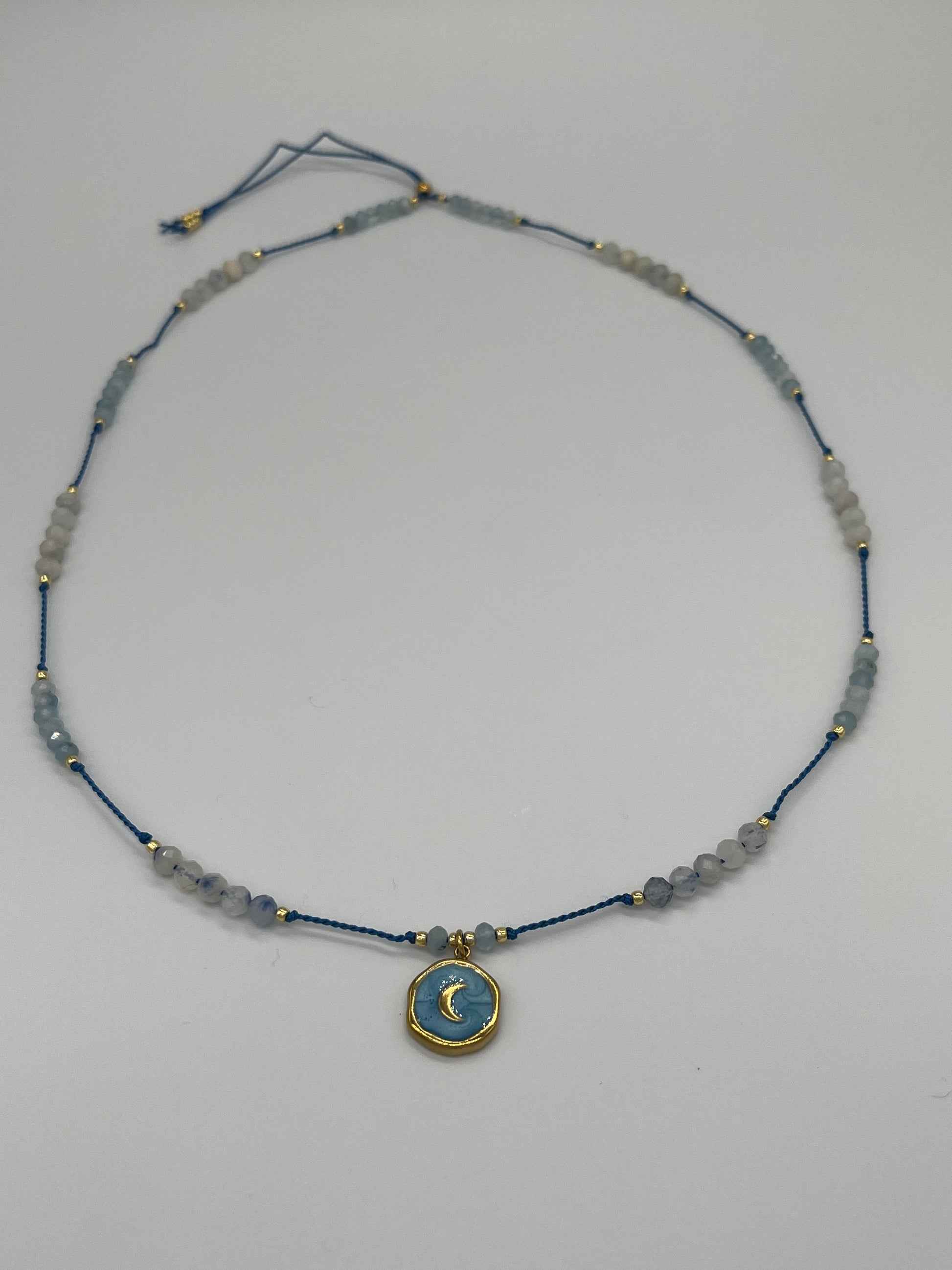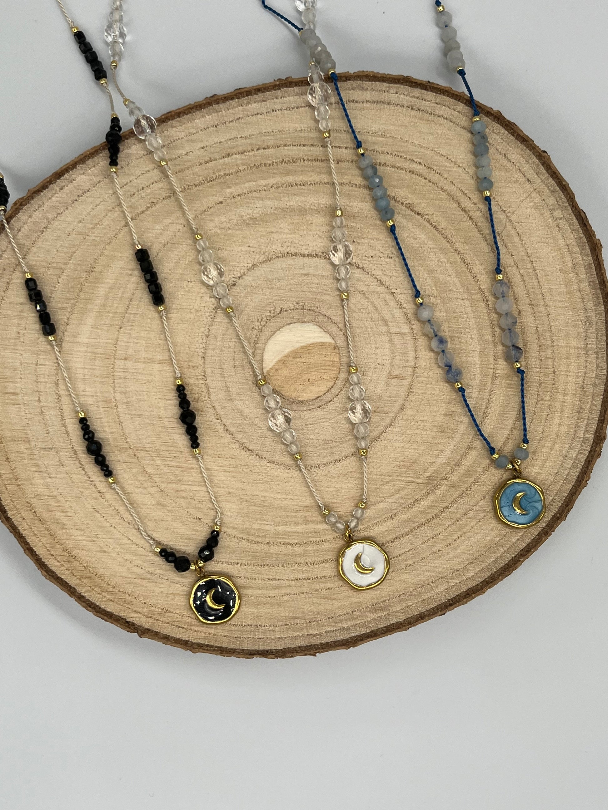 Naszyjnik Jedwabna Nić to połączenie delikatności i siły – miękki jedwabny sznurek otula szyję, a osadzone na nim kamienie i emaliowana zawieszka z Księżycem tworzą osobisty amulet.