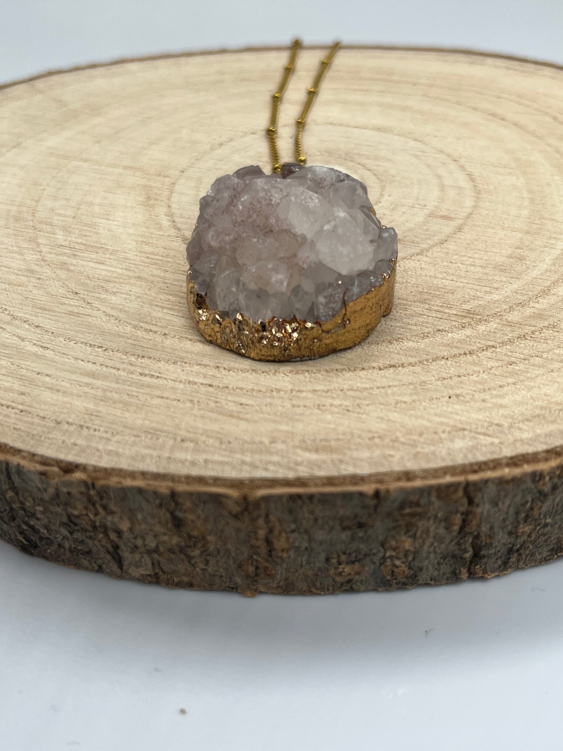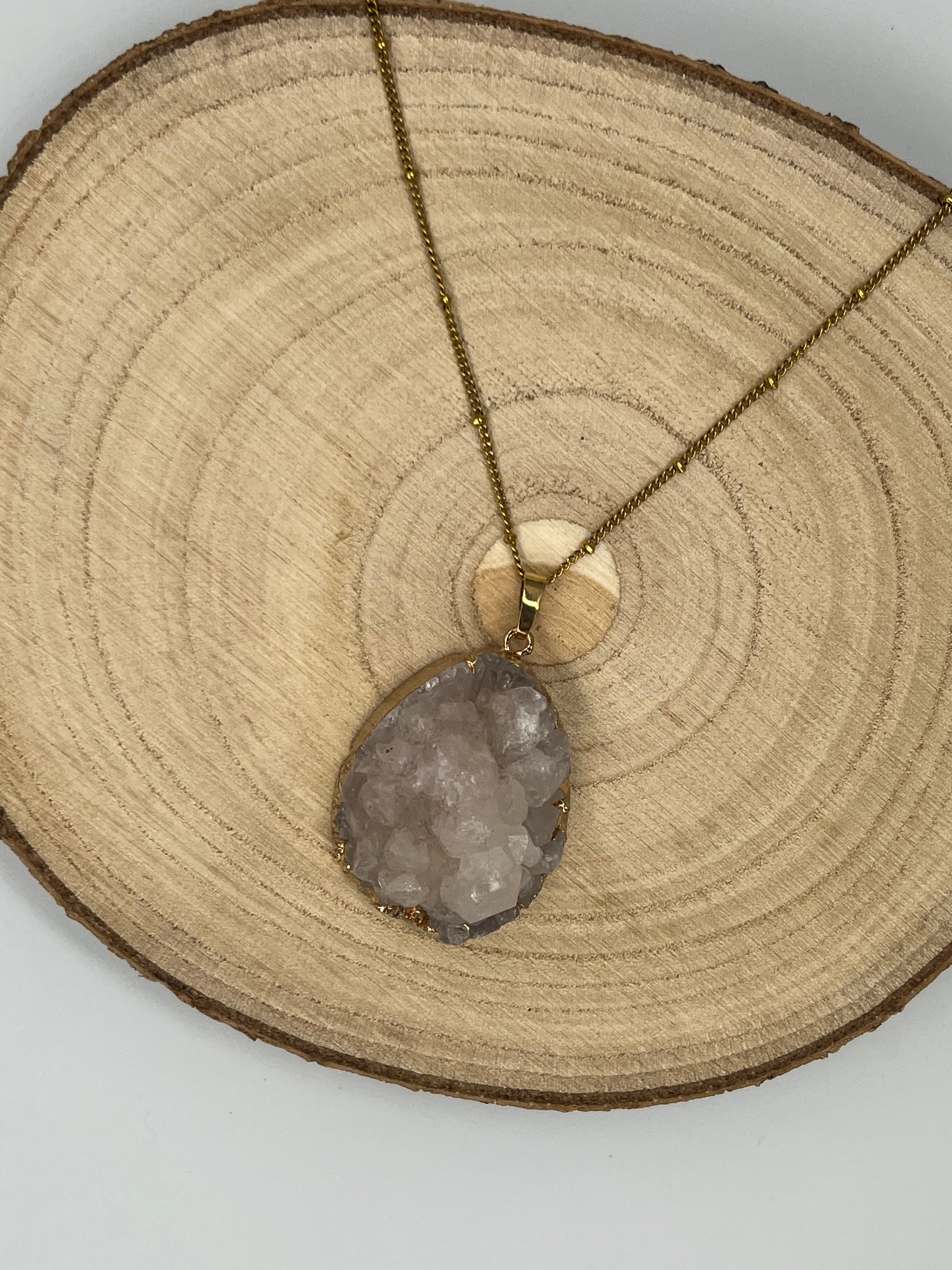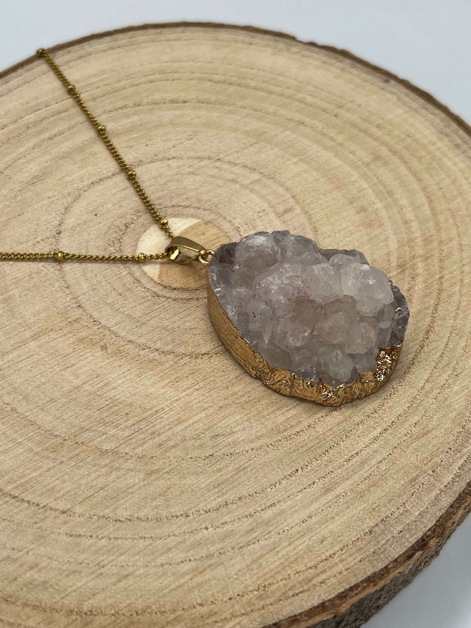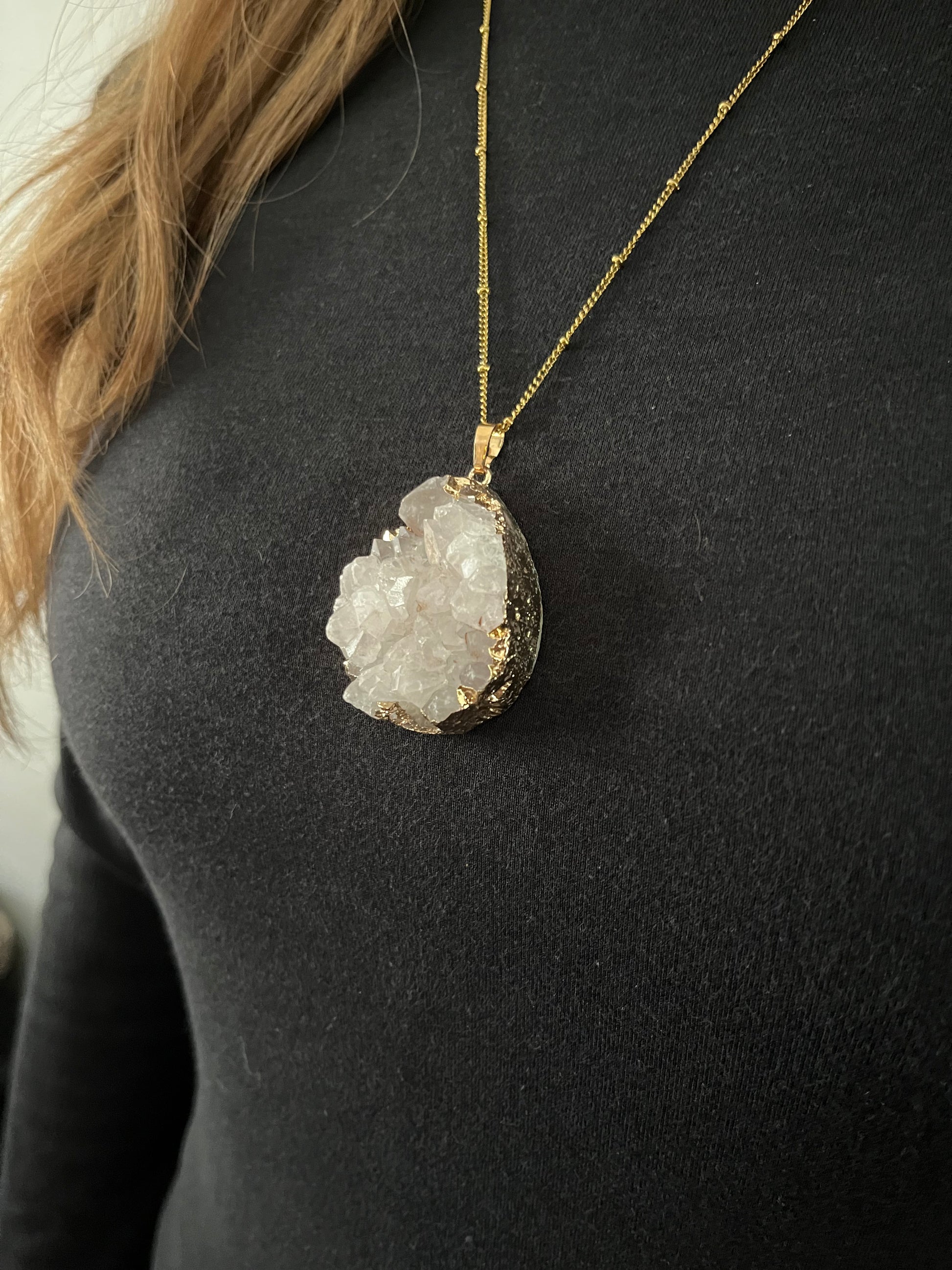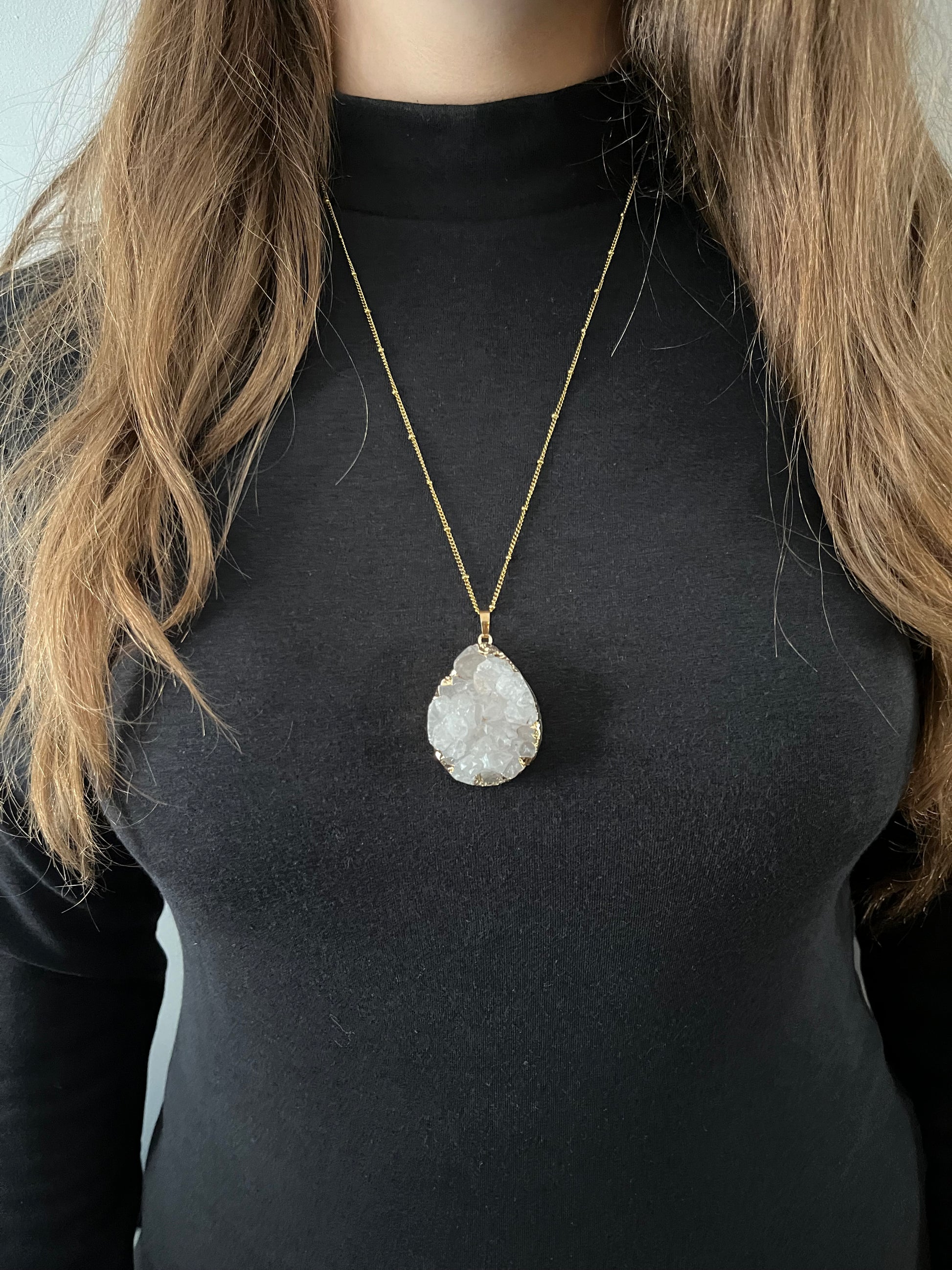Duża zawieszka z kwarcu i delikatny łańcuszek z małymi kulkami – prostota, która mówi więcej niż tysiąc ozdób.