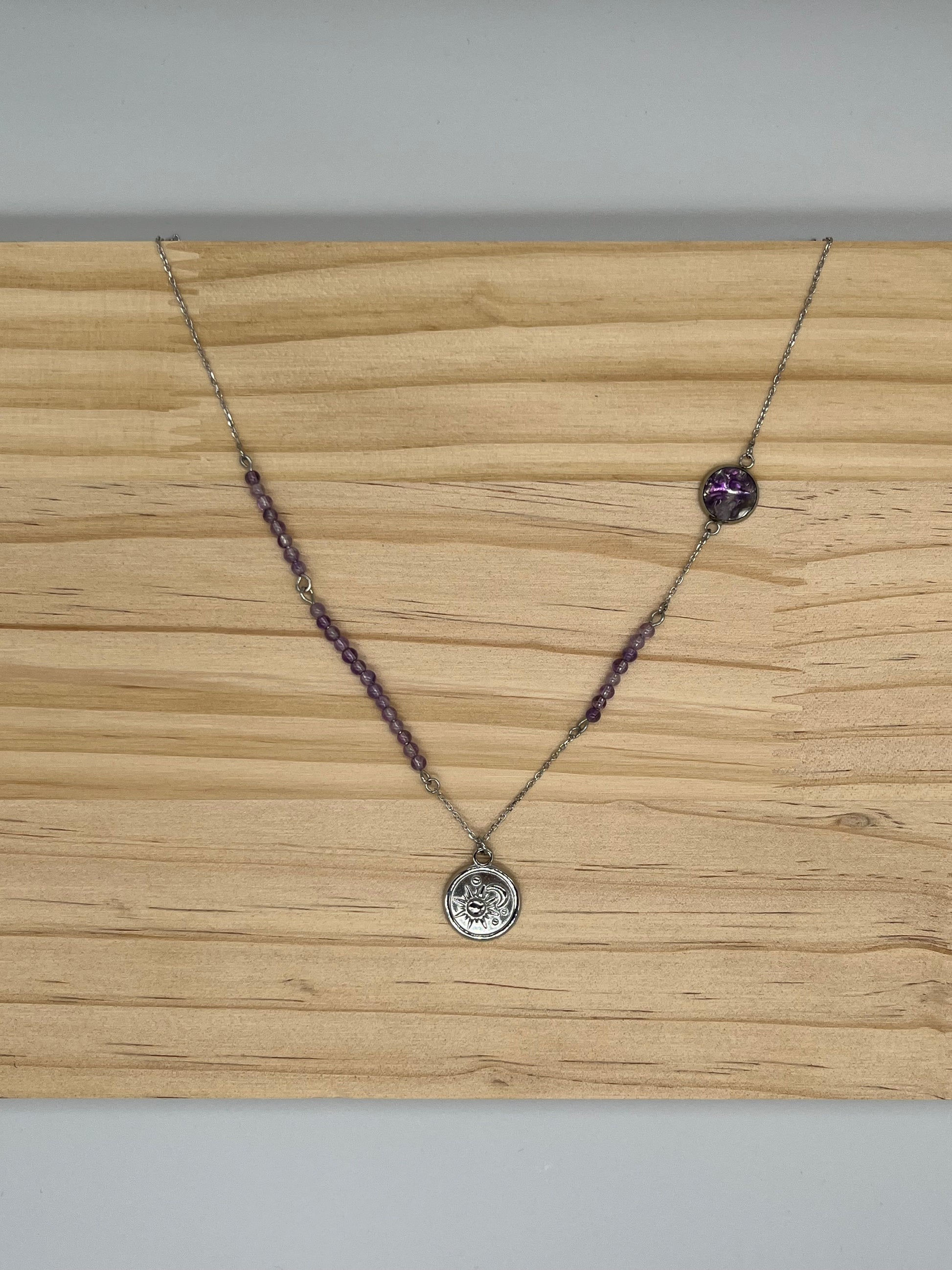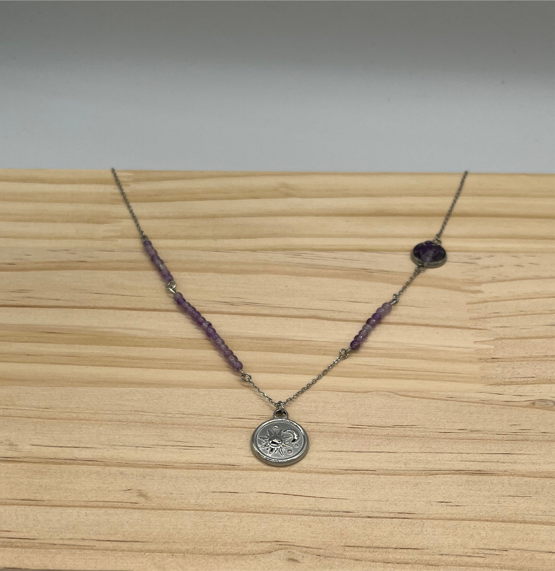 Naszyjnik z ametystami. Asymetryczny. Z własnoręcznie zrobioną zawieszką (łącznikiem) z kamieniami ametystu.