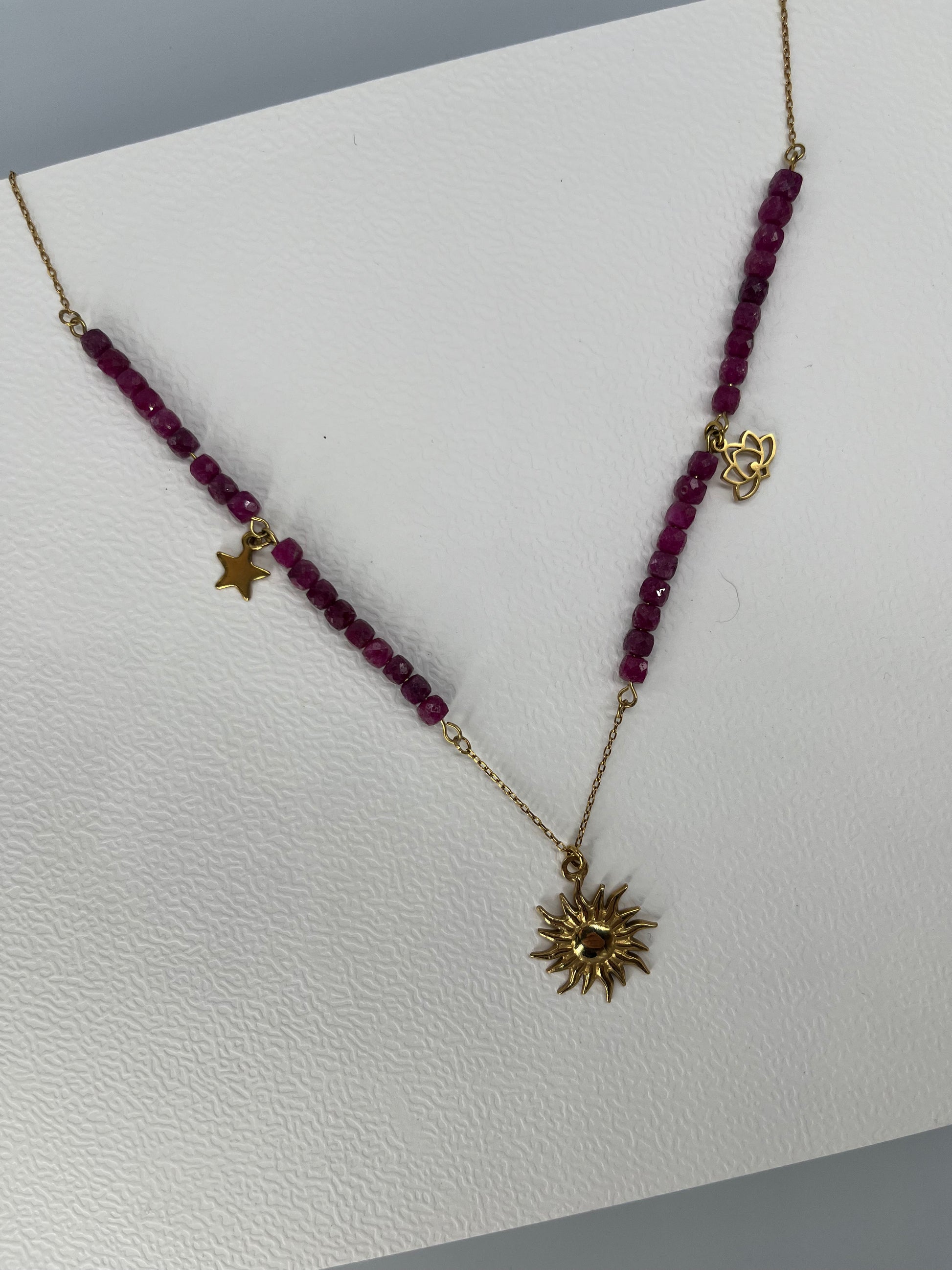 Wyrazisty naszyjnik z drobnymi rubinami i zawieszką w kształcie słońca – symbolem siły, energii i blasku. Dwie mniejsze zawieszki dodają mu lekkości i sprawiają, że delikatnie mieni się przy każdym ruchu. Rubin to kamień pasji i odwagi – przypomina, by świecić własnym światłem, niezależnie od okoliczności.