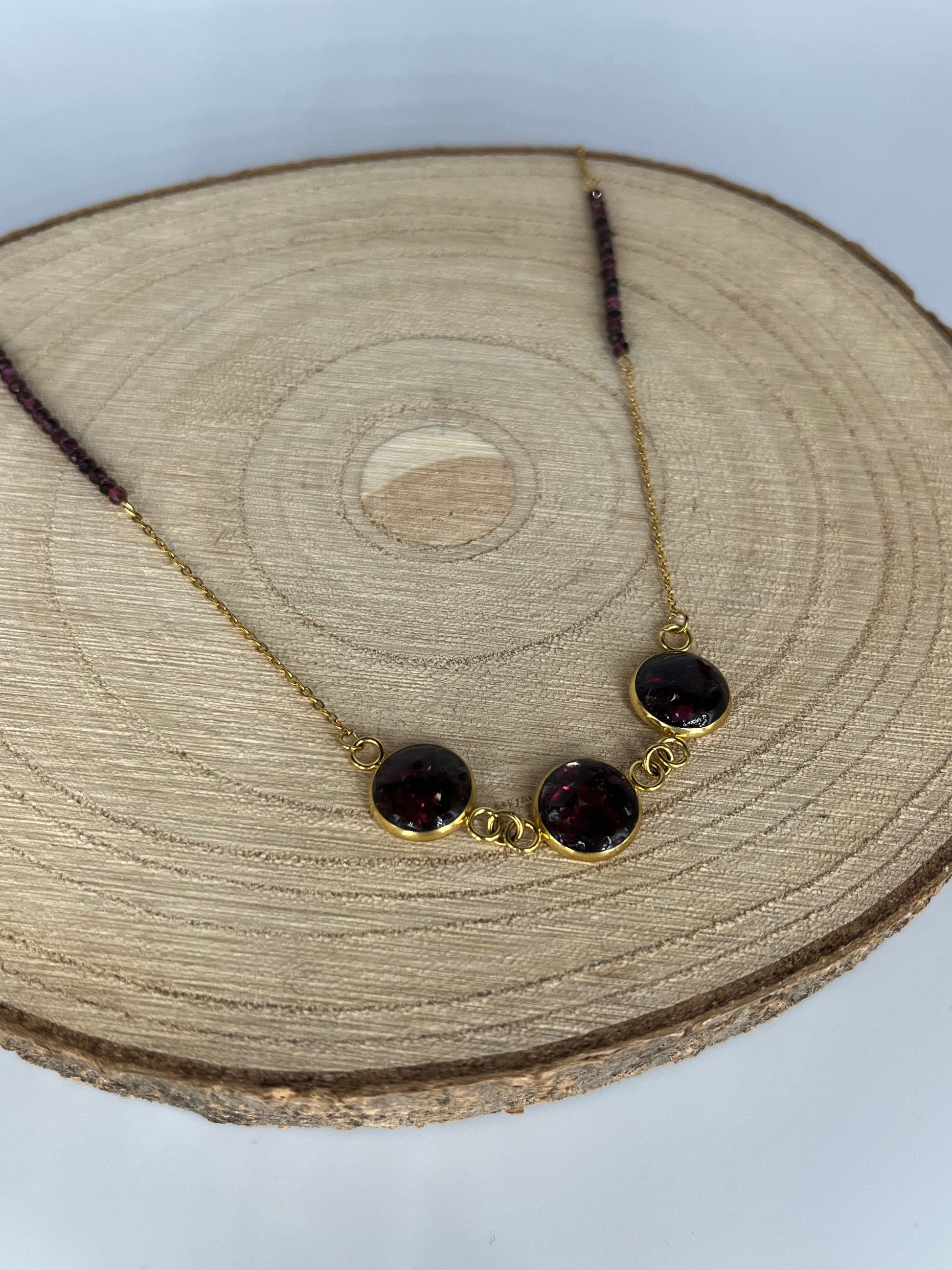 Trzy autorskie zawieszki z naturalnymi kamieniami granatu połączone delikatnym, złocistym łańcuszkiem i drobnymi koralikami tworzą symetryczną kompozycję o hipnotyzującej głębi. Głęboka czerwień granatu lśni w świetle niczym krople wina – zmysłowo, odważnie i z klasą.