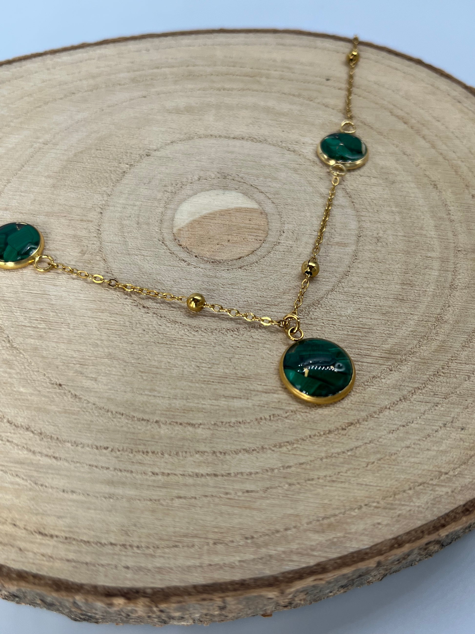 Trzy autorskie zawieszki z kamieni malachitu połączone delikatnym, złotym łańcuszkiem z drobnymi kuleczkami tworzą biżuterię, która emanuje spokojem i siłą jednocześnie. Zielone pasma kamienia przypominają fale energii płynące prosto z serca ziemi – harmonijne, żywe i uzdrawiające.