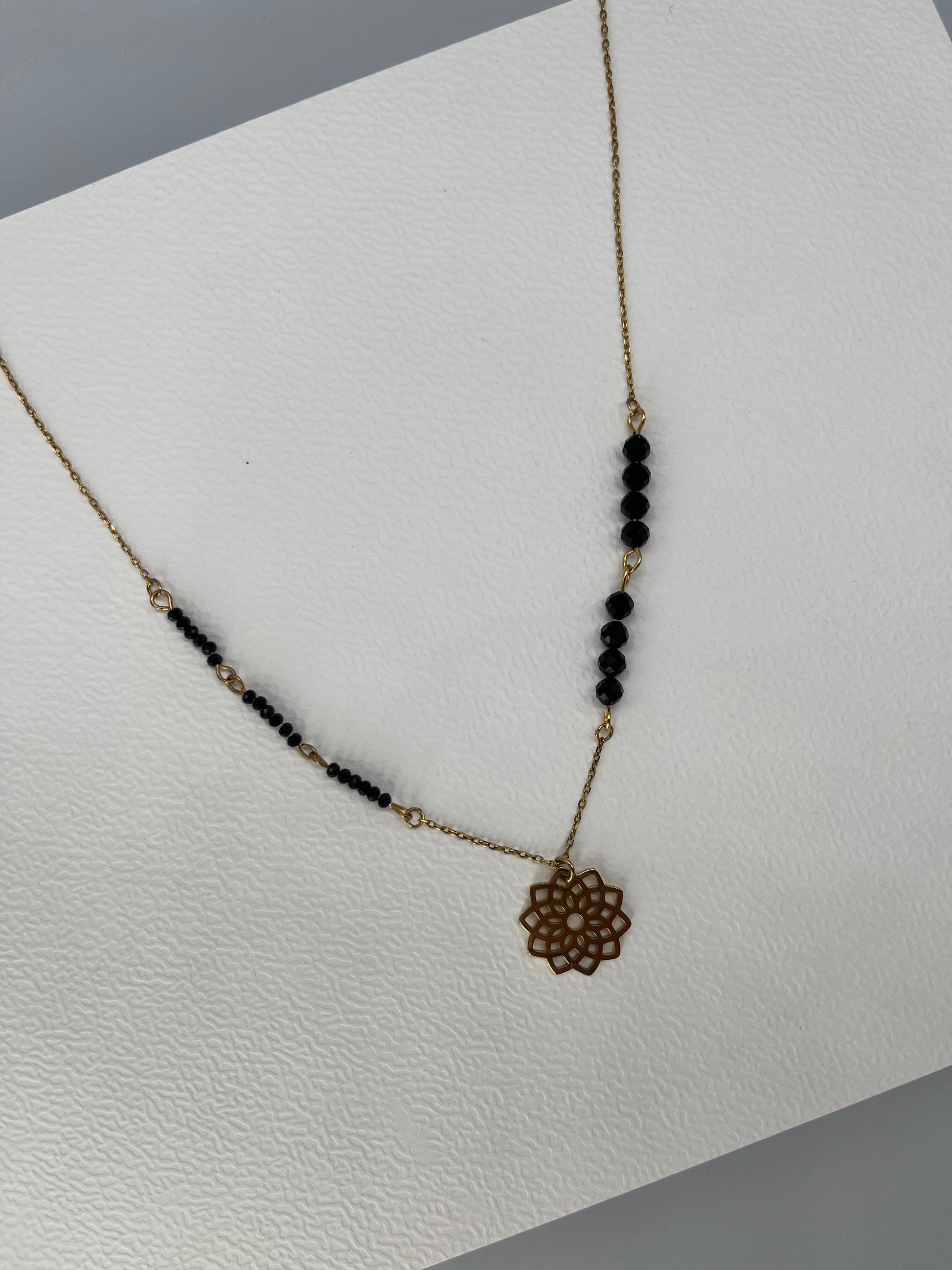 Delikatny naszyjnik z zawieszką w kształcie mandali i czarnymi turmalinani. Mandala symbolizuje harmonię i spokój, a czarny turmalin chroni przed negatywną energią i dodaje siły. Naszyjnik jest asymetryczny, co nadaje mu unikalnego i nowoczesnego charakteru.