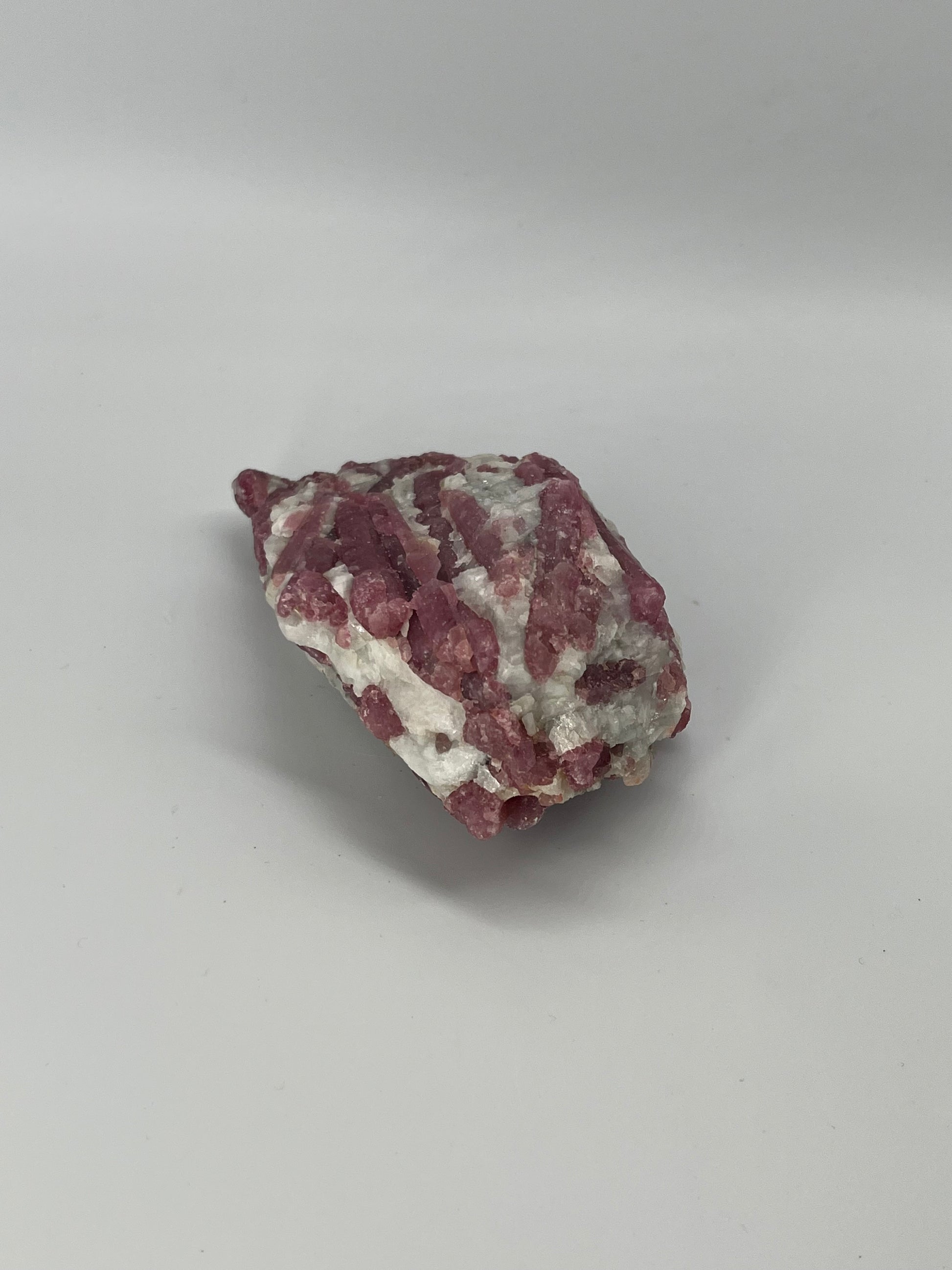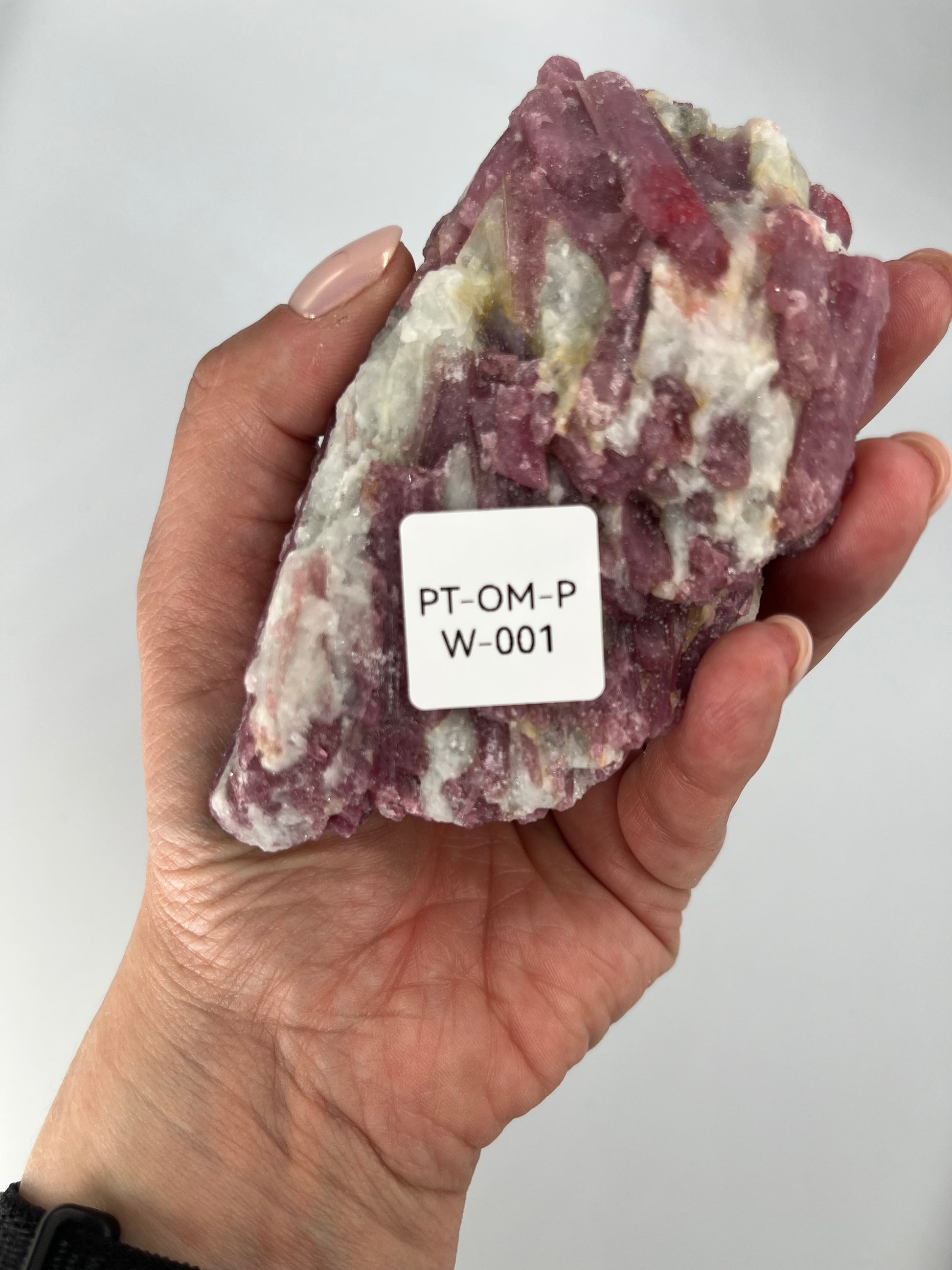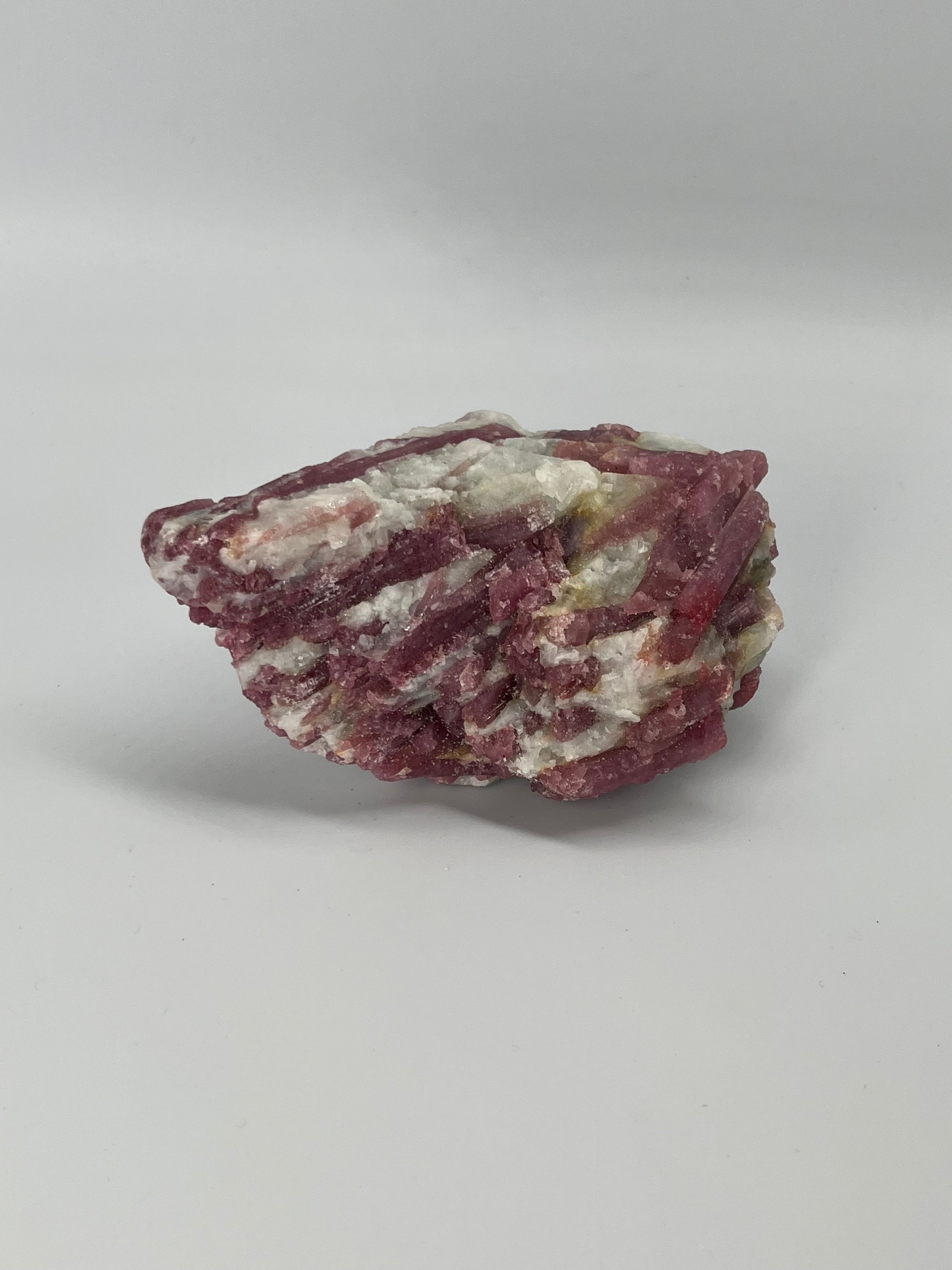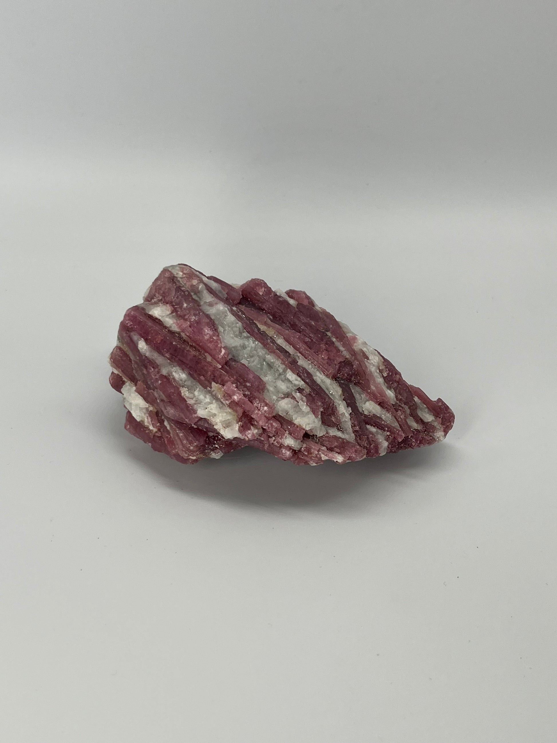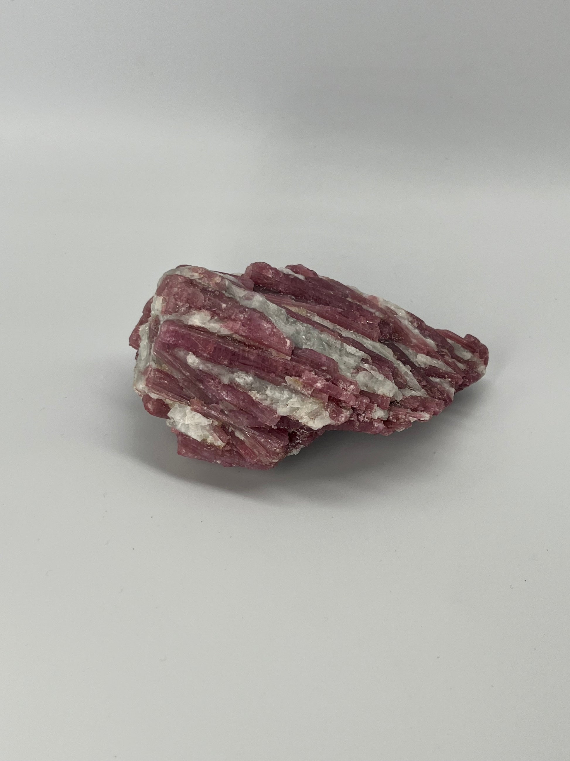 Surowa bryłka różowego turmalinu na kwarcu – intensywnie różowe, podłużne pasma pięknie kontrastują z jasnymi fragmentami skały. Naturalna tekstura i warstwowa struktura sprawiają, że wygląda jak żywioł w kamiennej formie – energetyczna, wyjątkowa i pełna charakteru 💗🤍