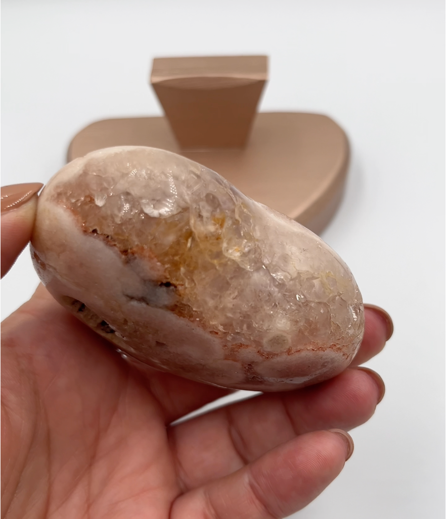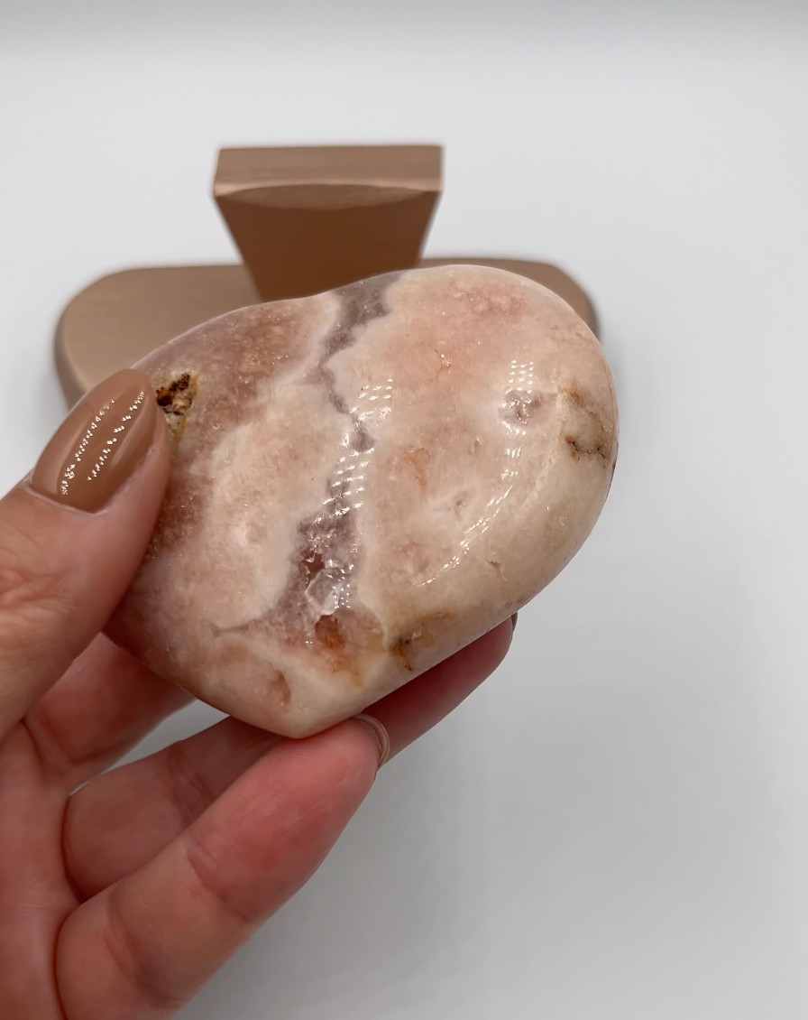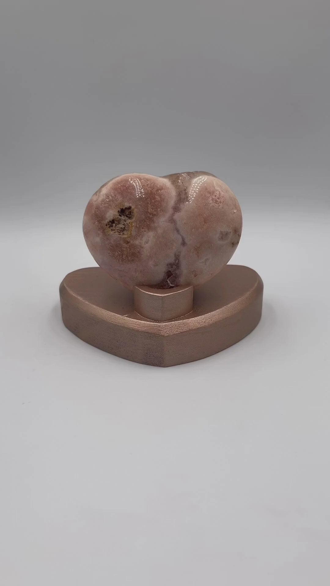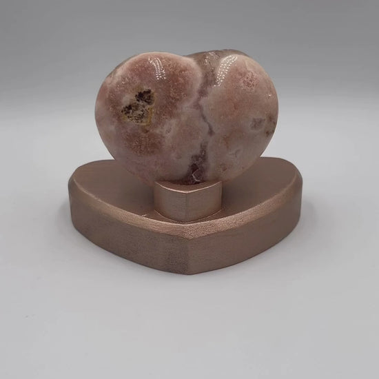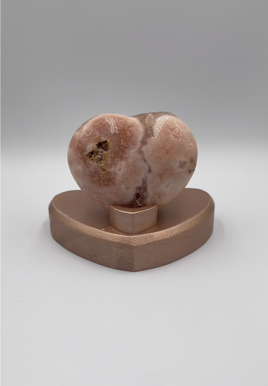 Delikatne serce z różowego ametystu spoczywa na drewnianej podstawce w kolorze różowego złota – połączenie natury i elegancji w najpiękniejszej formie 💗